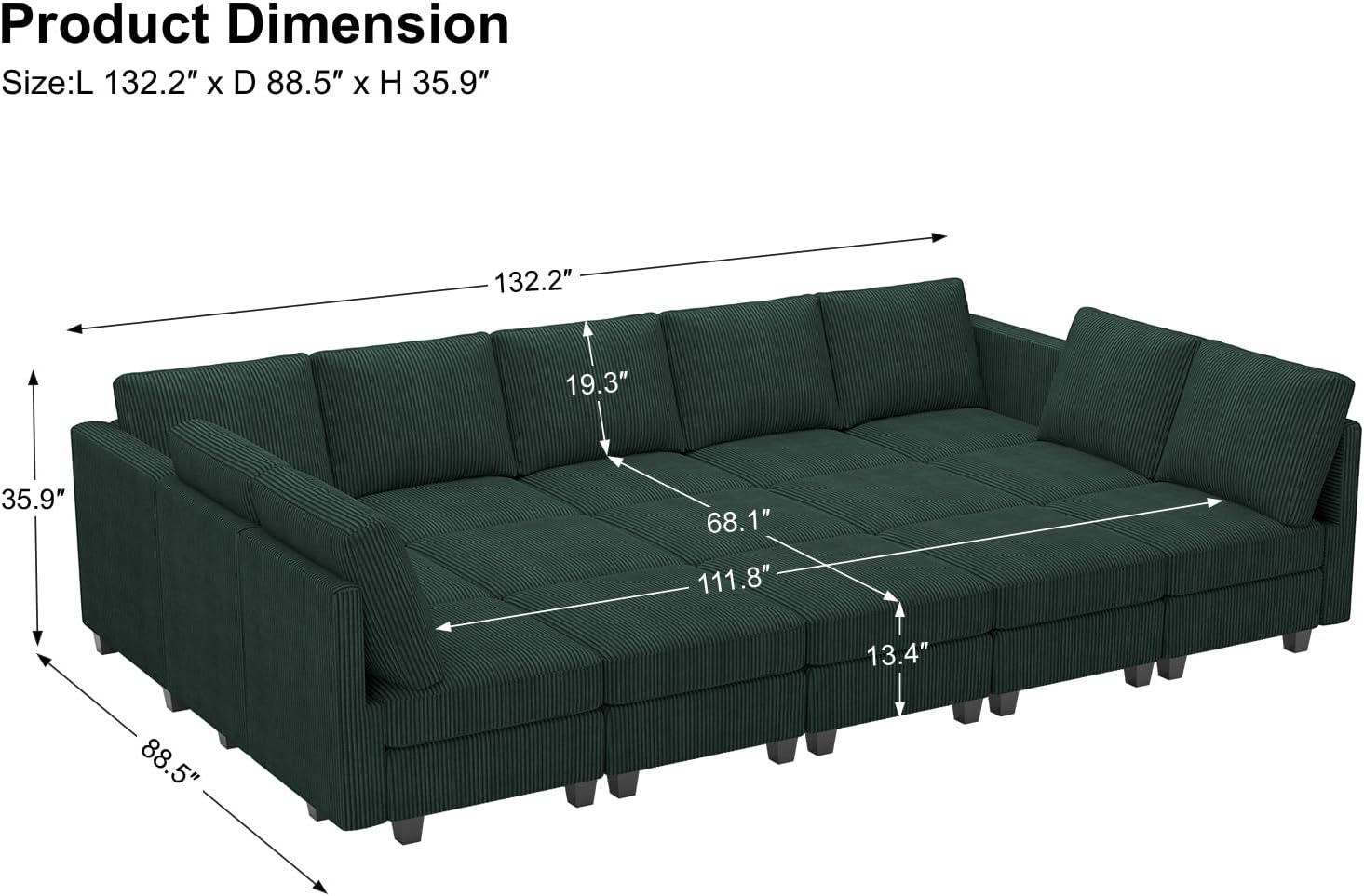 Belffin Large 15 Seat Modular Sectional Sofa with Storage Seat Corduroy Sleeper Sectional Sofa Bed Oversized Convertible Modular Couch for Living Room Green