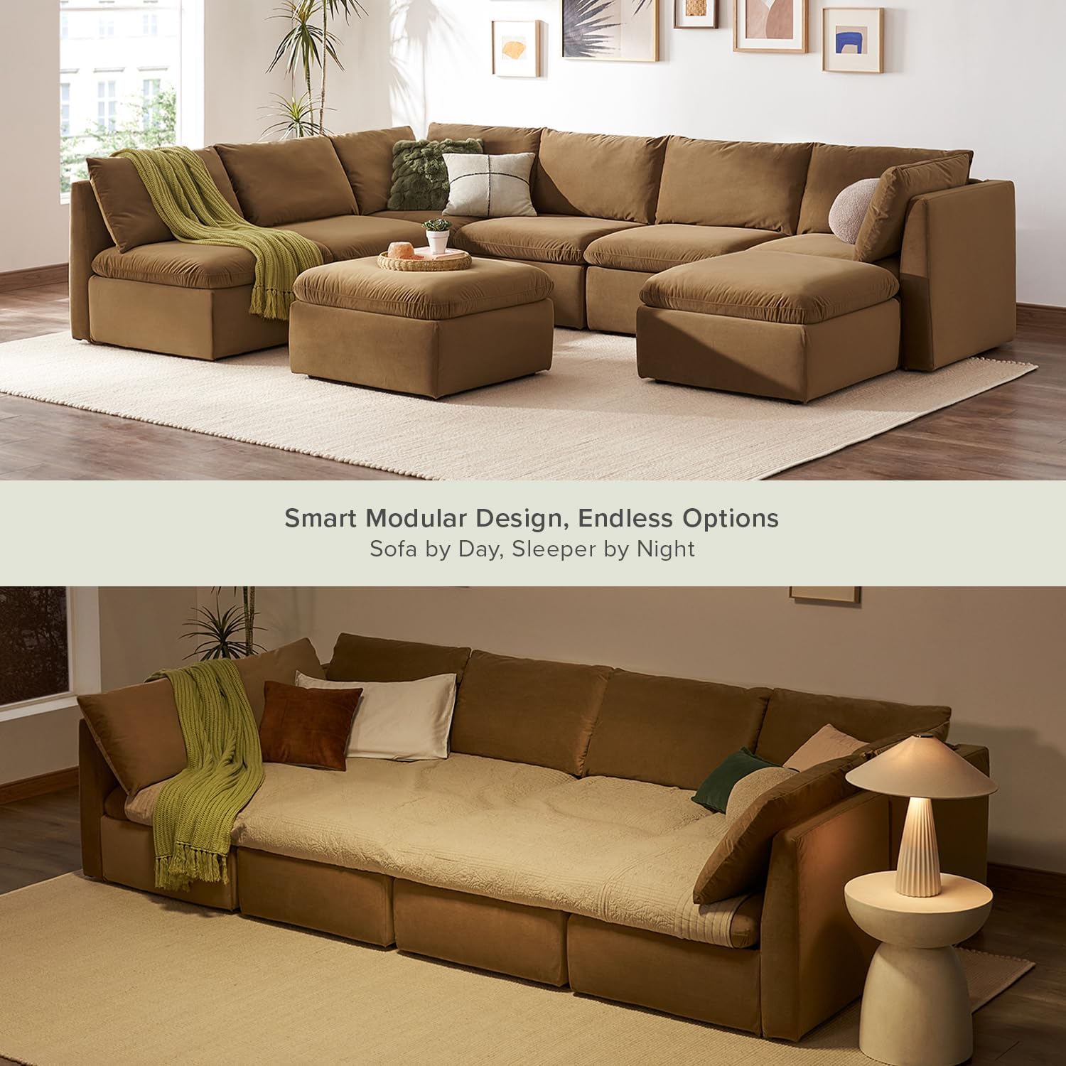 mopio Oversized Modular Sectional Sofa with Fully Removable Covers and Storage, Convertible U, L-Shaped and Sleeper Sectional, Modern Couches with Ottoman Chaise (Hazelnut Velvet, 8 Seats, Sleeper)