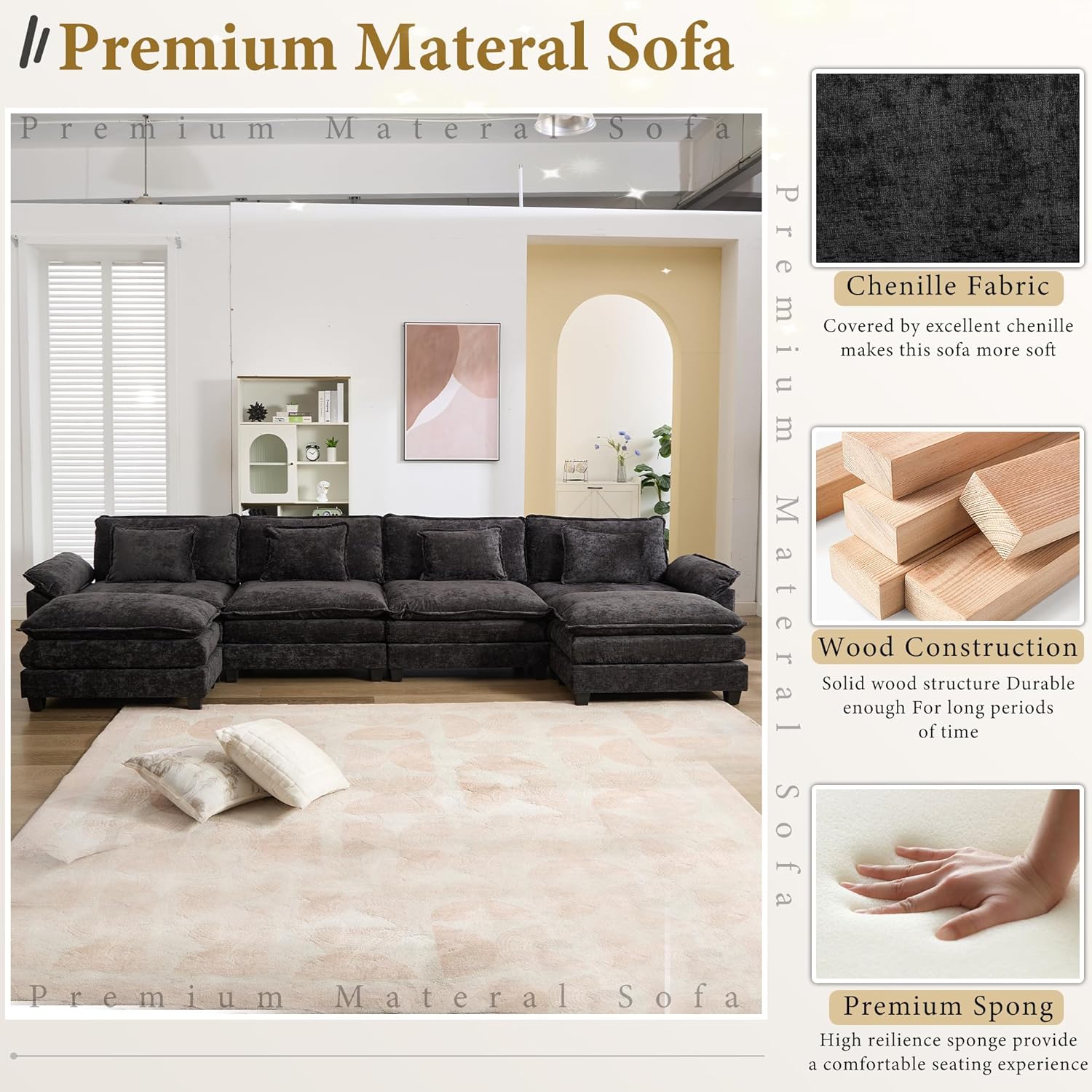 URRED Modular Sectional Sofa Comfy Cloud Couch, Modern Chenille Sofa Sleeper Deep Seat Couches with Ottoman/Pillows for Living Room (Black, 154'' - U Shape)