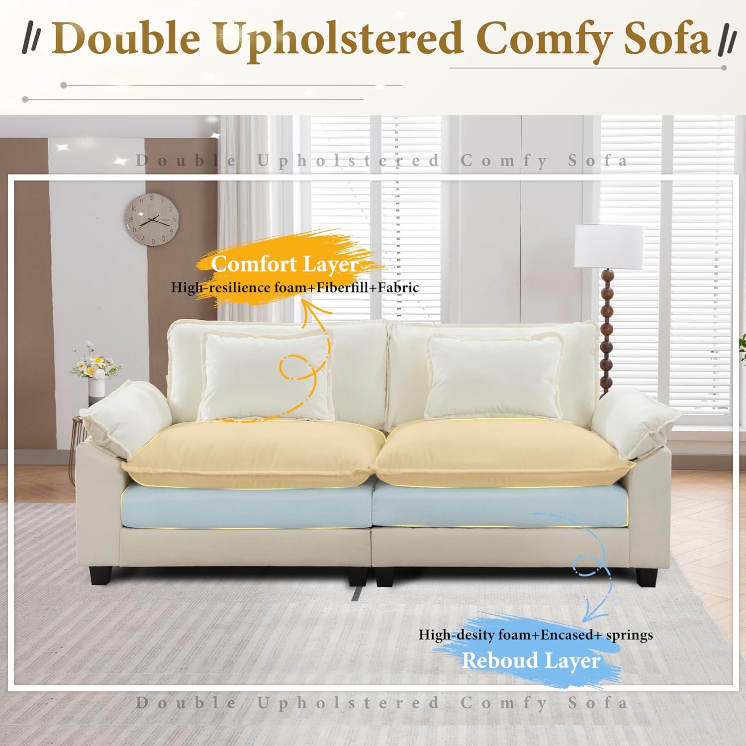 - Double Upholstered Sofa:The living room creative sofa is double thickly upholstered with high-density sponge padding and spring system, bringing luxurious comfort and support, greatly avoiding collapsing during long-term use.