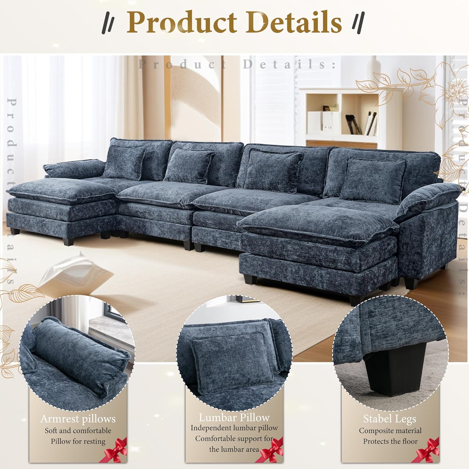 URRED Modular Sectional Sofa Comfy Cloud Couch, Modern Chenille Sofa Sleeper Deep Seat Couches with Ottoman/Pillows for Living Room (Blue, 154'' - U Shape)