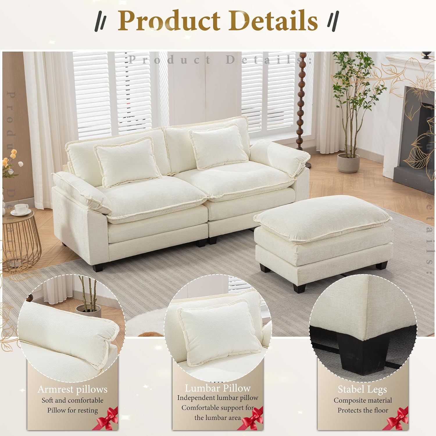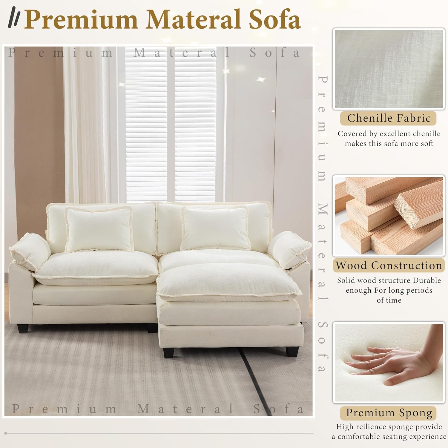 URRED Modular Sectional Sofa Comfy Cloud Couch, Modern Chenille Sofa Sleeper Deep Seat Couches with Ottoman/Pillows for Living Room (White, 82.6''- L Shape)