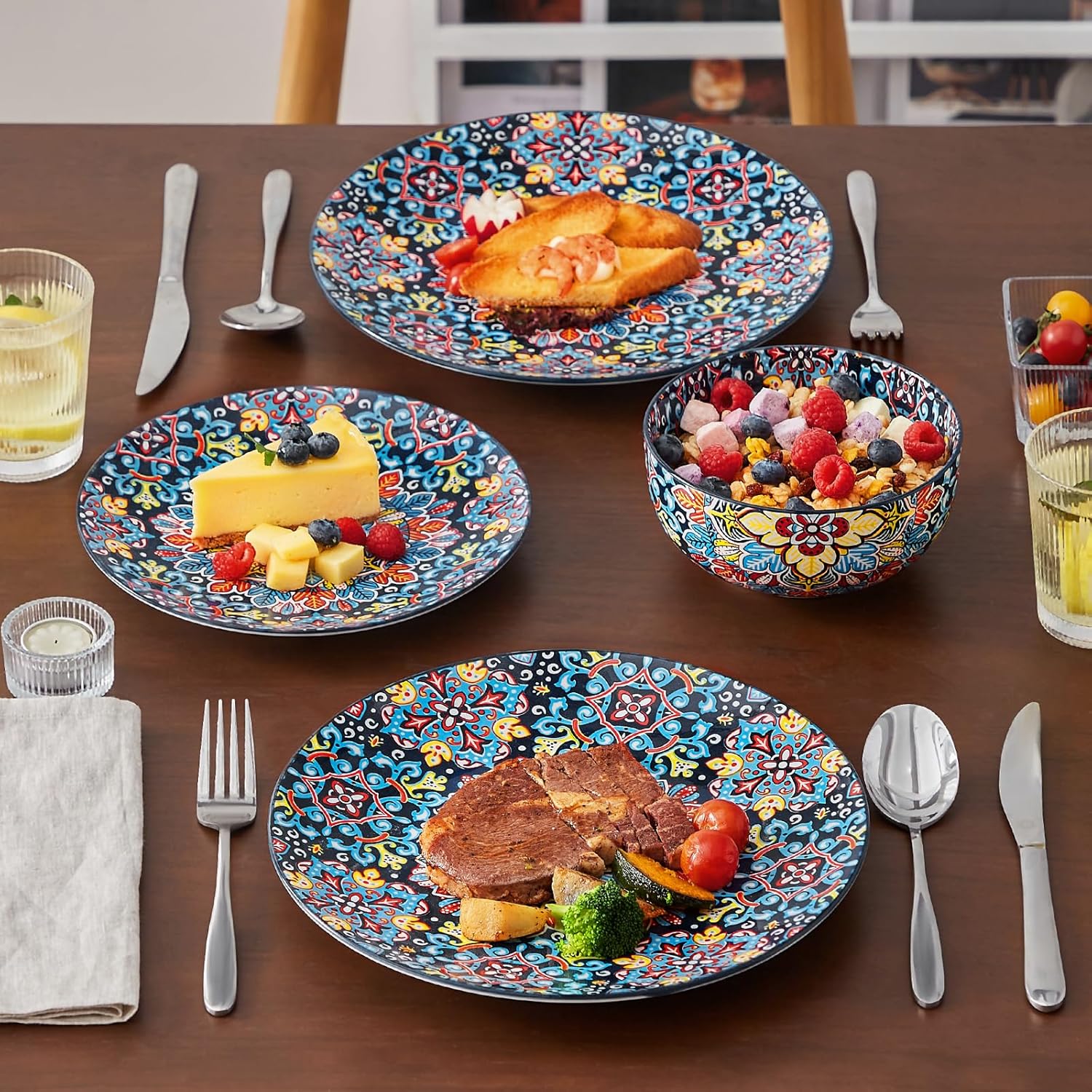 vancasso 12 Pieces Dinnerware Sets, Red Plates and Bowls Set, Porcelain Dishes Set for 4, Microwave and Dishwasher Safe, Scratch Resistant, Bohemian Style Dining Ware Service for 4, Series SIMI