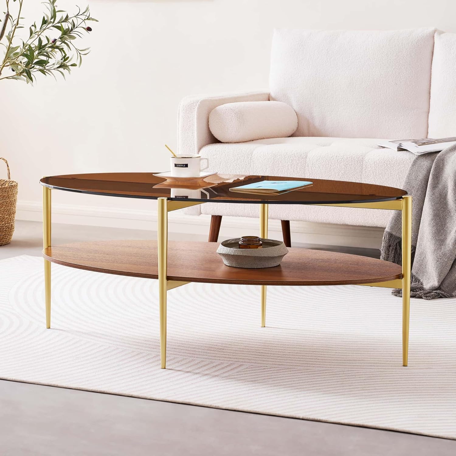 Oval Glass Coffee Table, Mid-Century Modern Design, L43 x W22 x H17 inch, 2-Tier Structure, Olive Shaped Amber Glass Top and Walnut Finish Wood Shelf, Tapered Legs with Gold Finish Frame