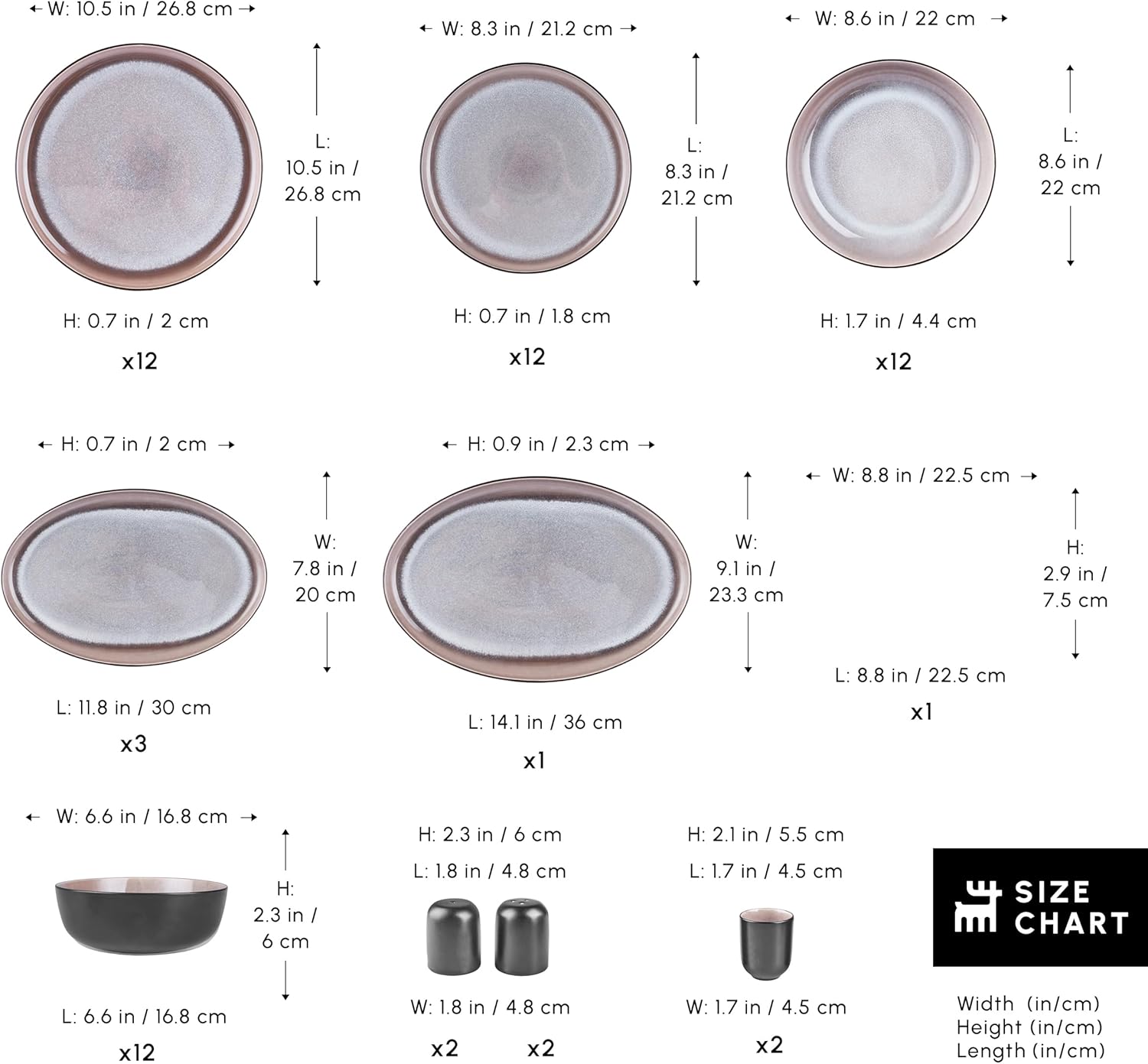 - Complete Set for 12: This plate set contains 12 dinner plates (26.8cm, 10.5ā), 12 dessert plates (21.2cm, 8.3ā), 1 salad bowl (22.5cm / 8.8"), 12 pasta bowls (22cm / 8.6"), 12 cereal/soup bowls (16.8cm, 6.6ā), 3 small serving platters (30cm / 11.8") and 1 large serving platter (36cm / 14.1"), 2 salt and pepper shaker and 2 toothpick holders. Designed to be used by 12 diners and ideal for family gatherings and special occasions.