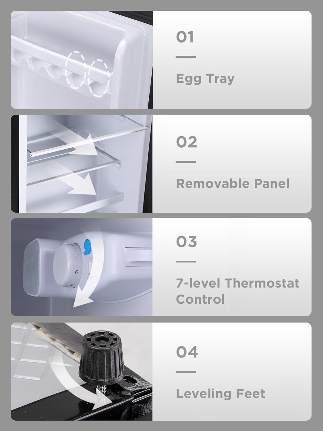 - Quiet & Energy-Efficient Operation: Designed for eco-conscious households, this compact refrigerator runs quietly at less than 40dBâquieter than a library whisper. Its energy-efficient design saves on electricity while keeping your space peaceful and undisturbed.
