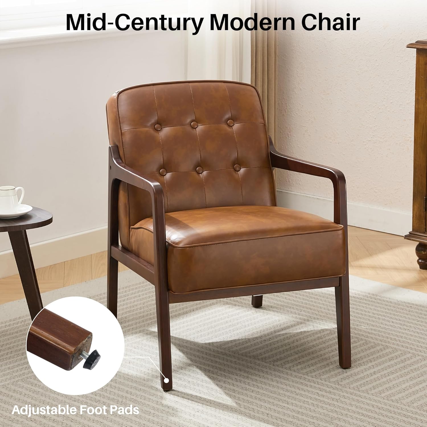 Faux Leather Accent Chair, Mid Century Modern Chair for Living Room, Upholstered Comfy Lounge Armchair with Solid Wood Frame, Reading Side Chair for Bedroom,105°Ergonomic Comfort, Brown