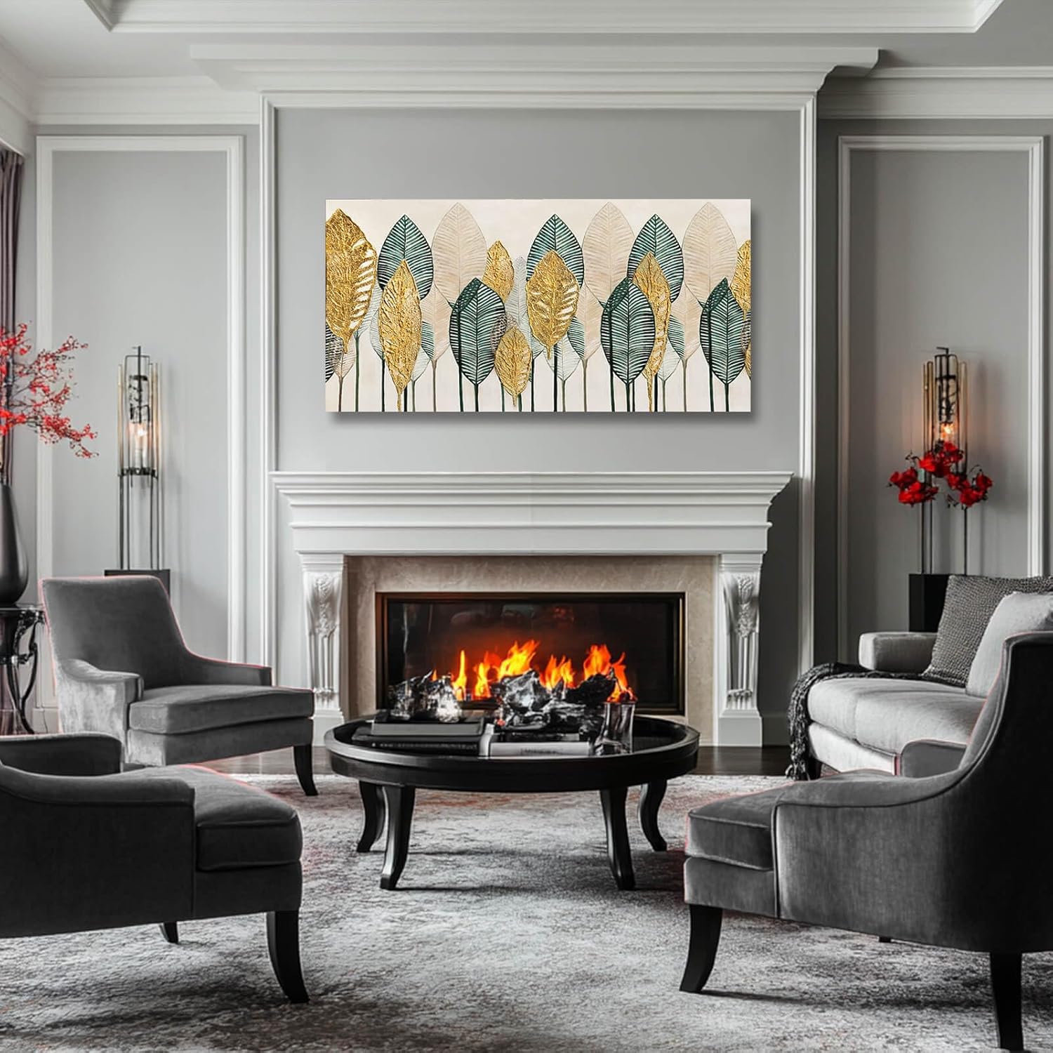 CHUDANHAO Green Wall Art Gold Wall Decor Leaves Prints Pictures Textured Bedroom Decor Line Painting Green Paintings Wall Decorations 24”x48” Artwork for Living Room Dining Room