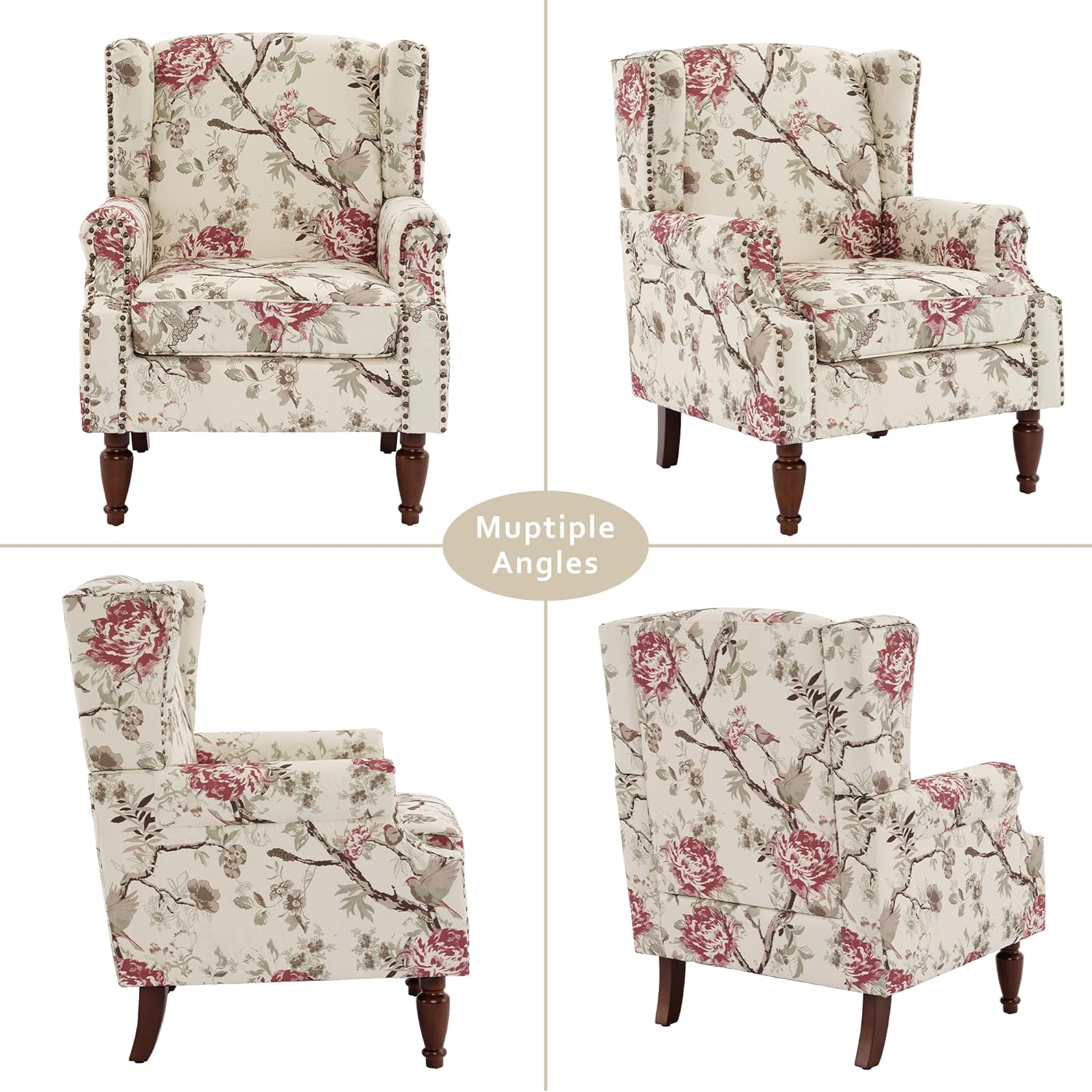 Lumibee Wingback Accent Chair,High Back Floral Armchairs in Fabric,Comfy Upholstered Reading Single Sofa Chair with Solid Wood Legs for Living Room,Bedroom,Office-Floral Beige
