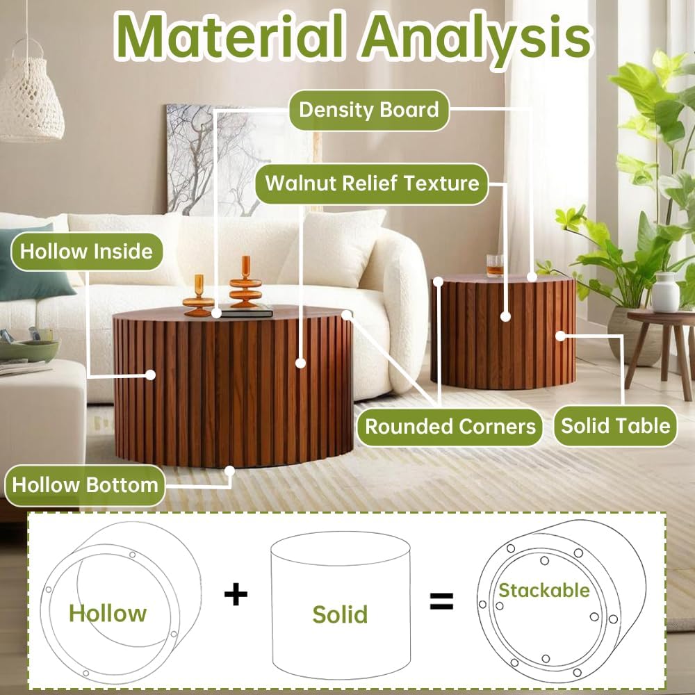 Round Nesting Coffee Table Modern Fluted Coffee Table Set of 2 Stripe Round Coffee Tables Circle Drum Coffee Tables for Living Room (Walnut Small)