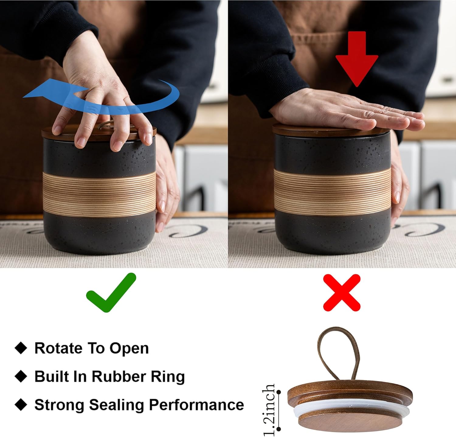 - Rope Cover Design: Each food storage container is equipped with a wooden lid, which has strong sealing and effectively isolates air, moisture, and odors, keeping food dry and fresh, and extending the shelf life of food. There is a unique rope design on the lid, which is easy to open without losing its beauty