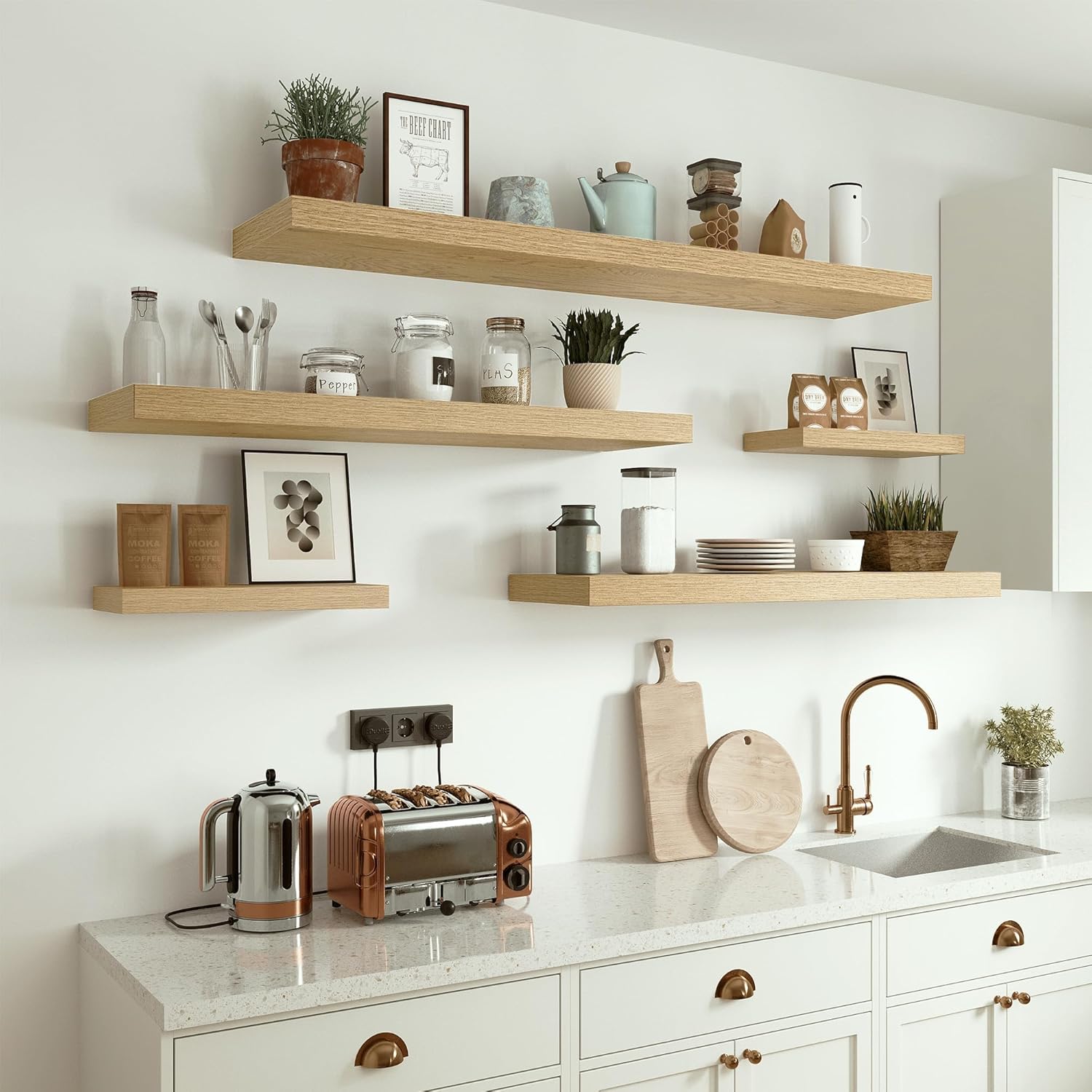 • Well-designed Floating Shelves - The rustic style floating shelves combining both practicality and style. These shelves offer a generous deeper and thicker surface, perfect for organizing daily sundries without taking up valuable floor space. The various of selected colours finish adds a cozy, natural element,display your art pieces on the wall to decorate your home, and make it full of aesthetic flare.