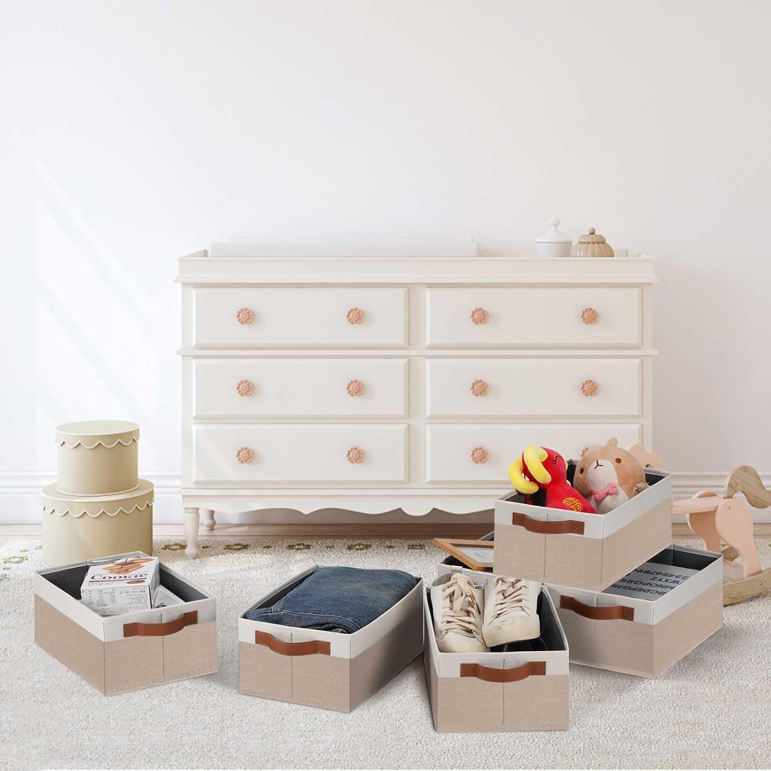 - 👍【QUALITY MATERIAL】Storage baskets for shelves are made of high-quality cationic fabric and polyester cotton fabric, and the inner layer is made of non-woven fabric, which is odorless, long-lasting and strong. Classic faux leather handles that adds a comfortable touch and provides a strong and comfort grip to pull and move. Fabric storage bin is easy to clean, just wipe with a damp sponge or cloth.