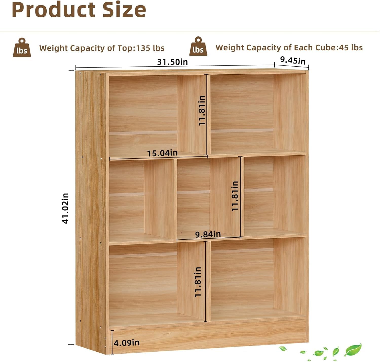 - [Sturdy Structure & Elevated Base]The design of the bedroom bookshelf makes its structure more stable and less prone to deformation, which allows it to accompany you for years. The elevated 4.13in" base can keep your books away from dust and dampness, which also makes it easier for cleaning. Each open cube of the natural bookshelf can hold up to 45 pounds. Size:Size:31.5''L x 9.45''W x 41.02''H.
