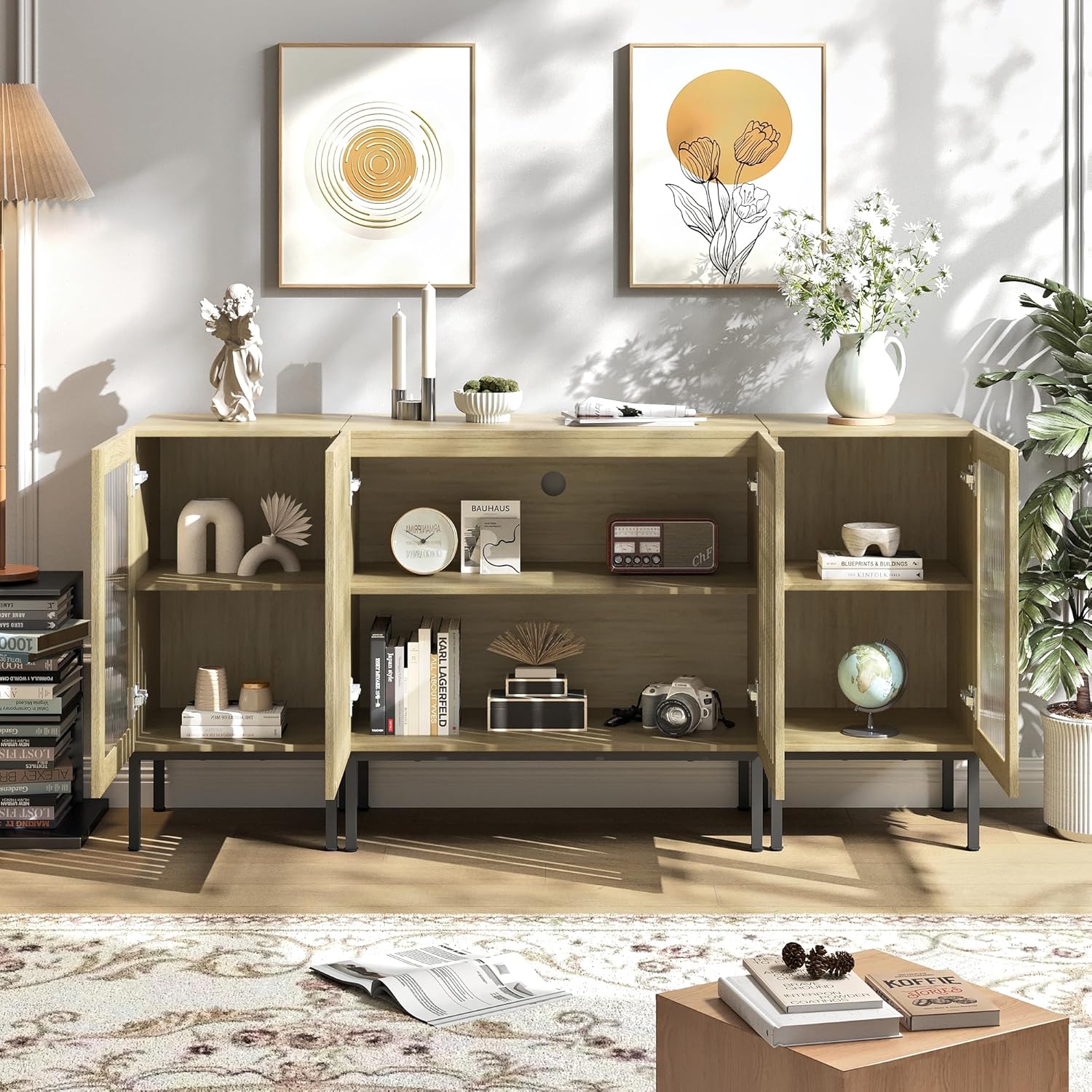 - Unique Design: This Farmhouse TV stand features 2 transparent tempered glass doors, designed to offer a clear and convenient view of your stored items. It allows you to showcase your favorite cutlery, wine glasses, bowls, and dishes, while simultaneously adding an artistic and elegant touch to your room.