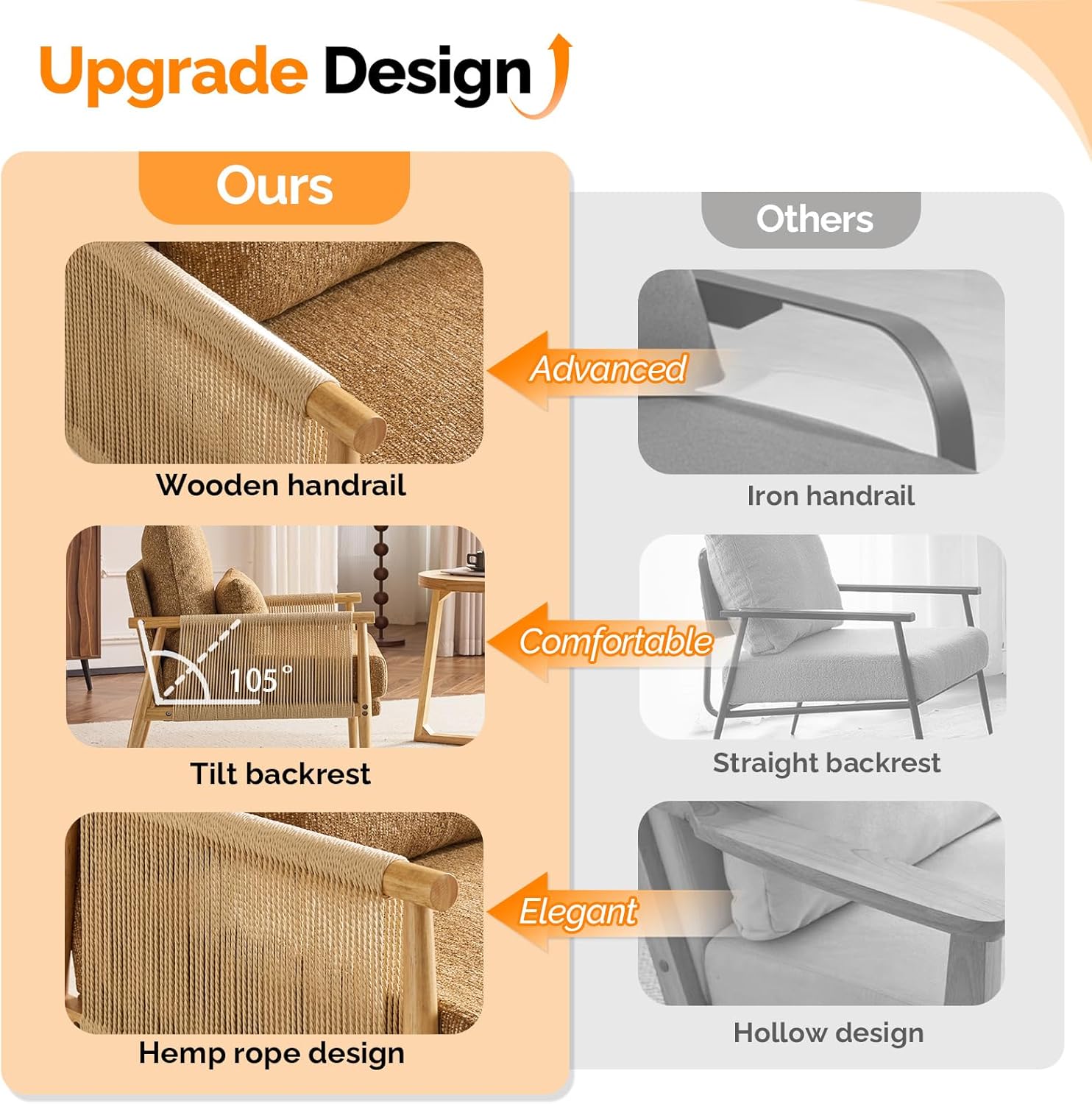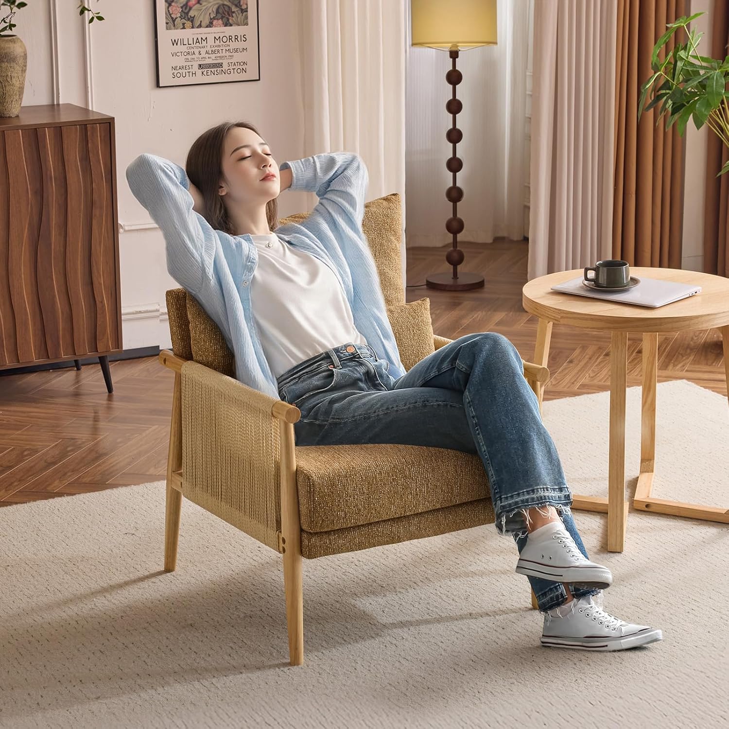 VINGLI Boho Braid Accent Armchair,Mid-Century Modern Chiar with Solid Wooden Armrest,Comfy Louge Cushion Chair with Waist Pillow for Bedroom,Living Room,Reading Room, Khaki