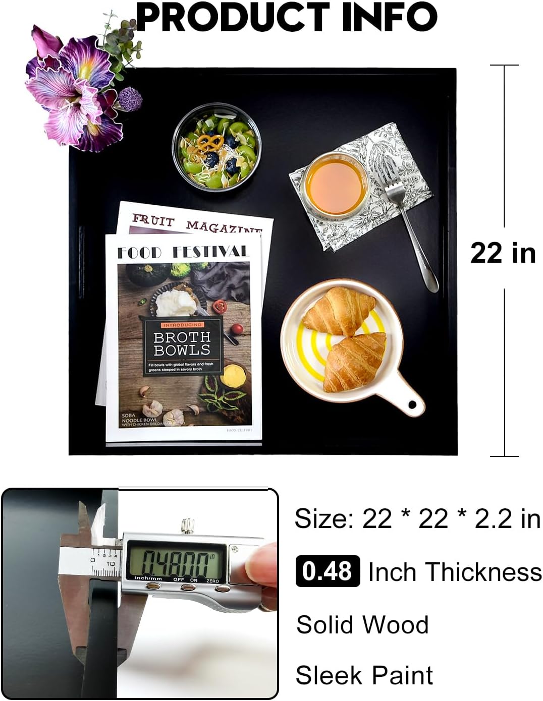 - 22 INCH OTTOMAN TRAY - This extra large serving tray is perfect for a variety of uses. Measuring 22" x 22" x 2.2", it’s ideal for serving drinks on the coffee table, organizing items on your couch, or using it in the kitchen. This stylish tray combines both functionality and aesthetic appeal to enhance your home.