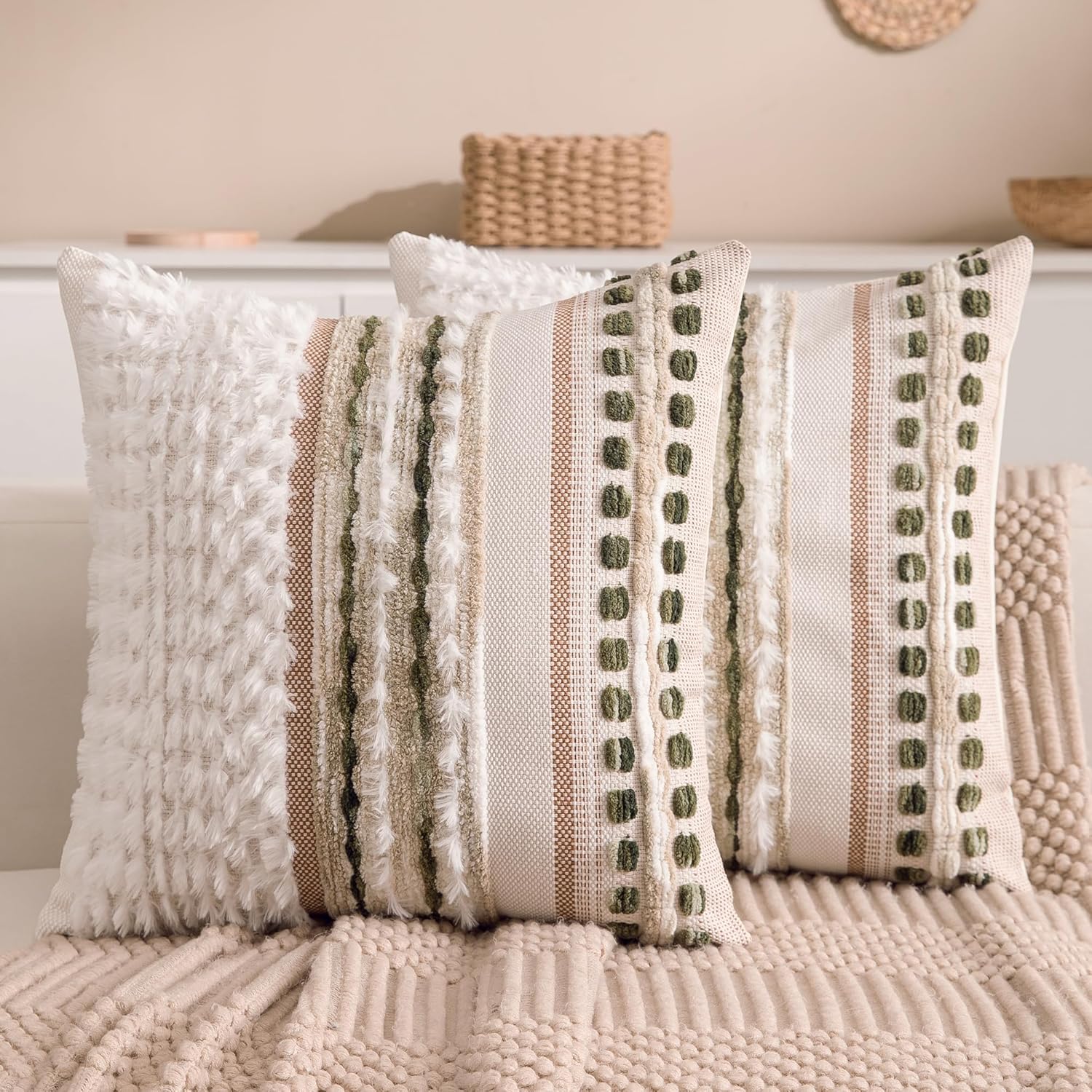 Boho Chenille Tufted Couch Throw Pillow Covers 18x18 Inch Set of 2 Farmhouse Striped Decorative Pillow Covers Accent Neutral Square Pillowcase Green Cushion Covers for Livingroom Sofa Bed