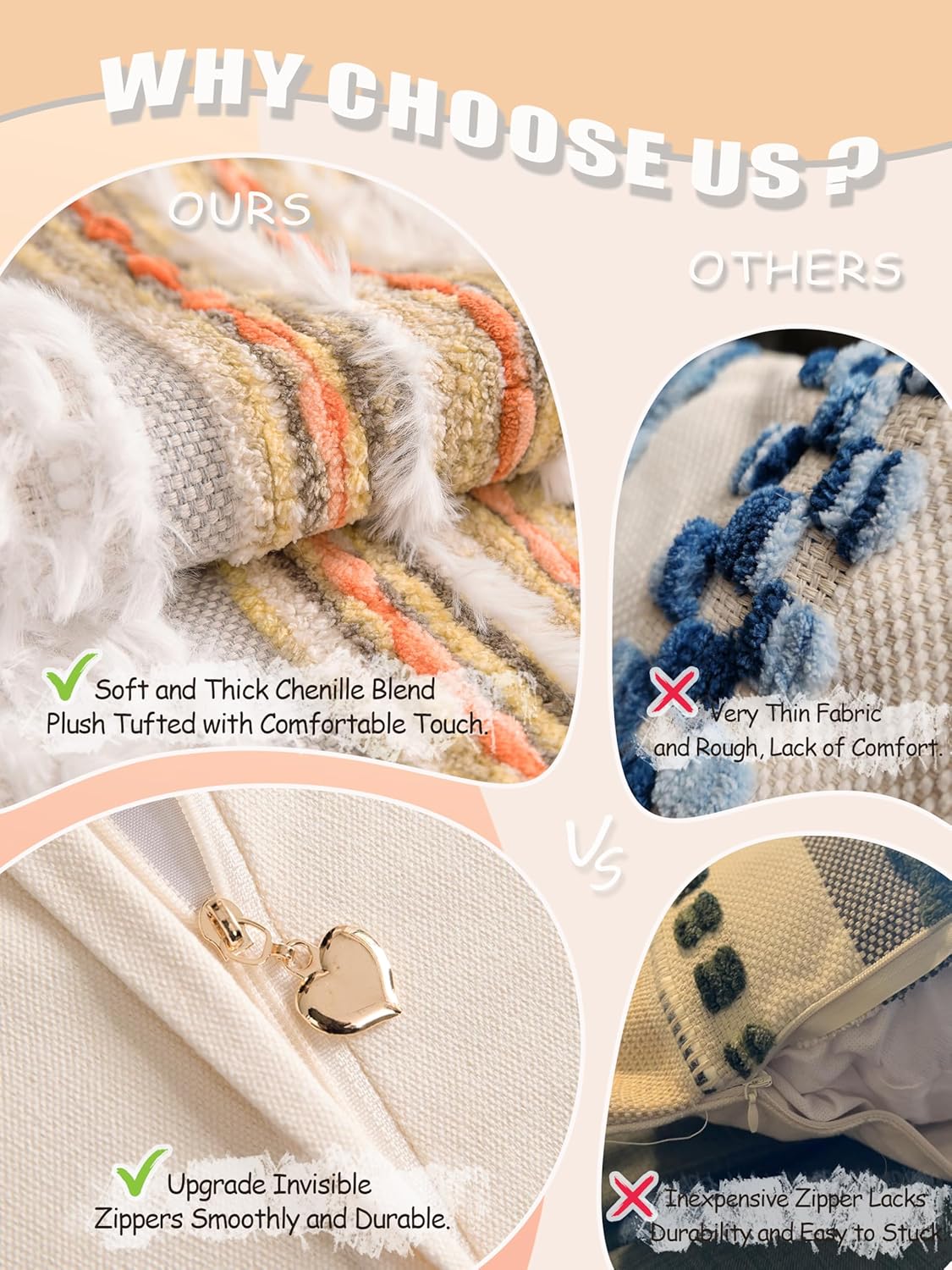 - INVISIBLE ZIPPER CLOSURE: Designed with a smooth heart invisible zipper, these cushion covers provide a seamless look while ensuring easy insertion and removal of pillow inserts. our high-quality zippers enhance durability and smoothness compared to ordinary zippers, ensuring struggle with a faulty zipper.