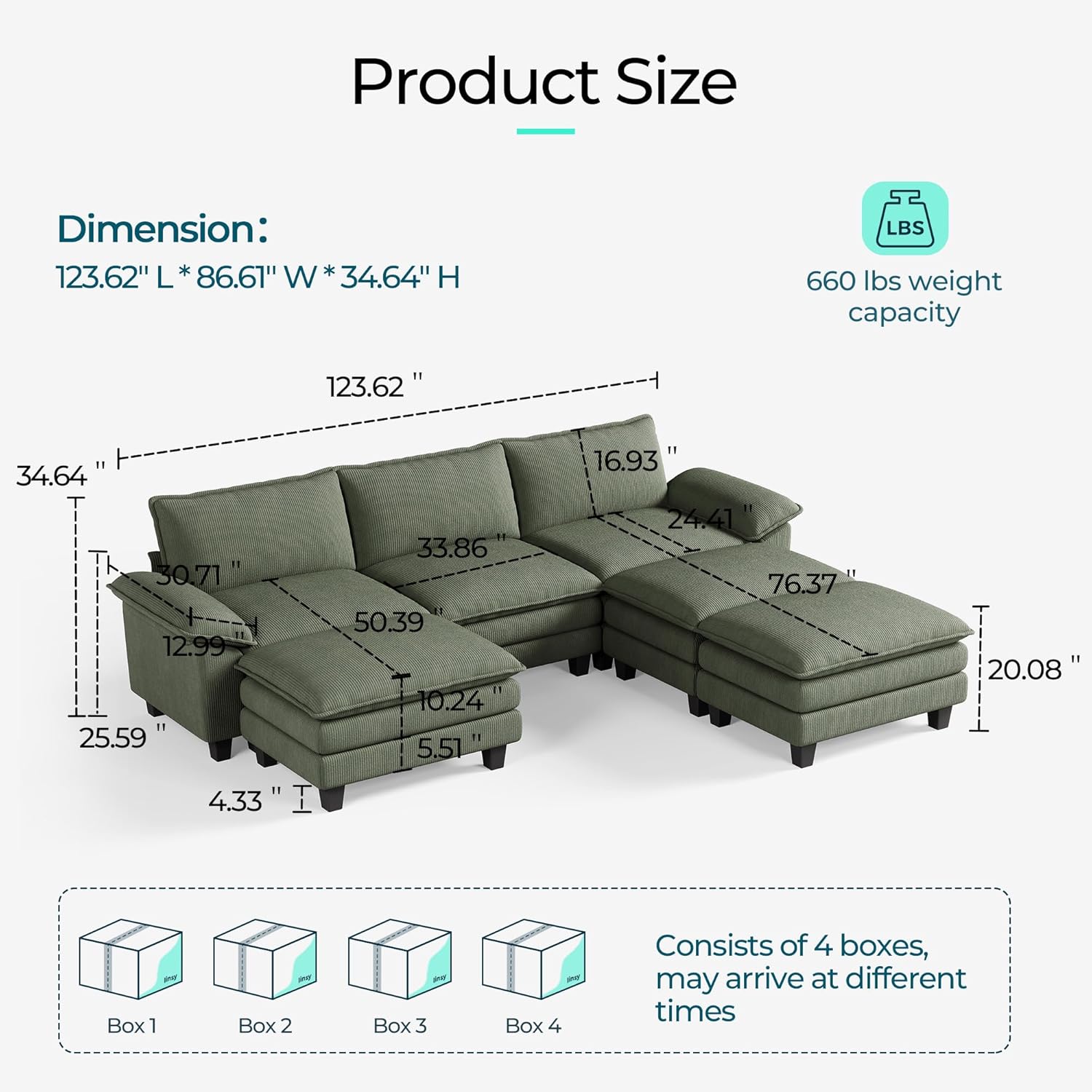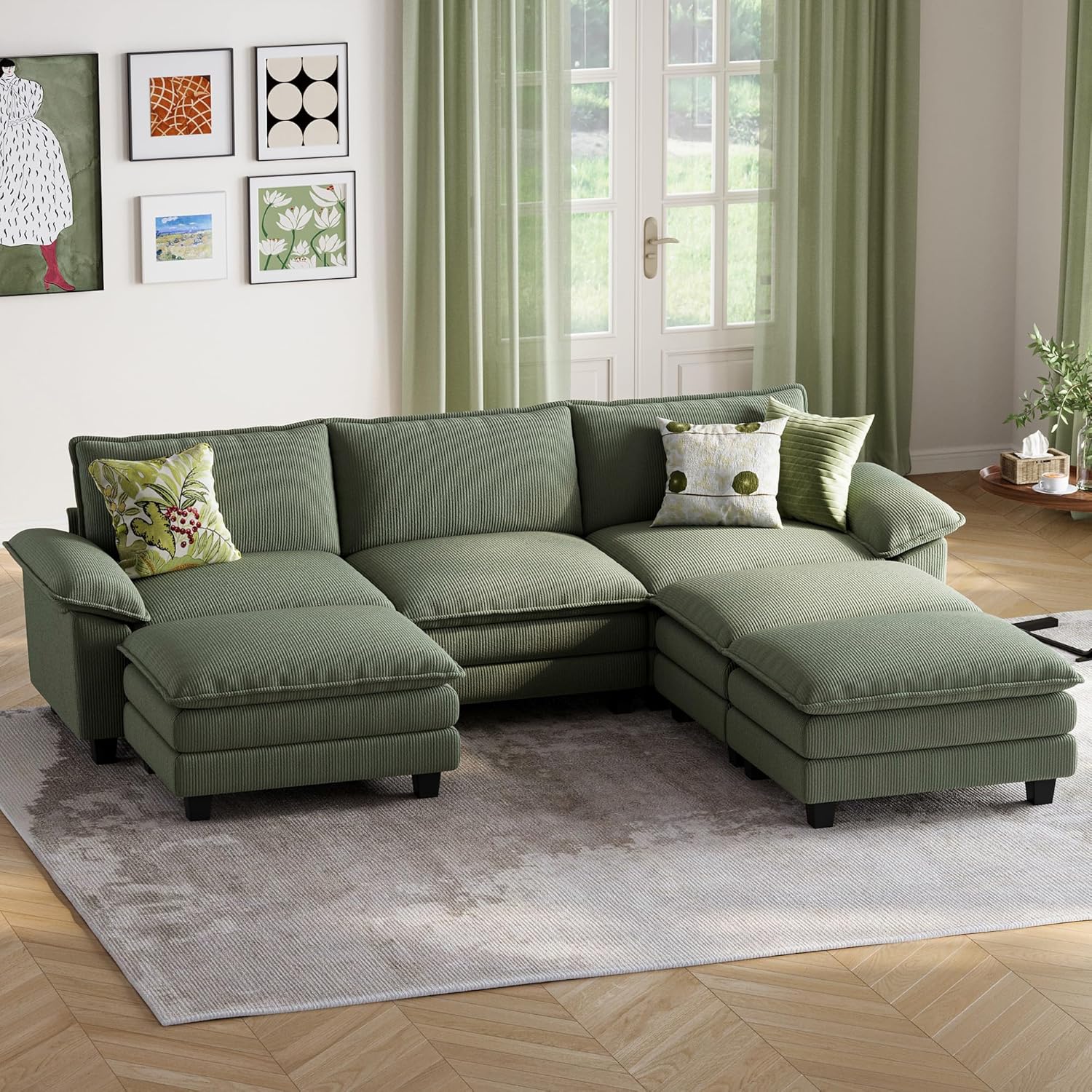 LINSY HOME Sectional Sleeper Sofa - 123'' Modular Cloud Couch Oversized Corduroy Sofa Bed with Movable Ottoman Soft Modern Comfy Couch for Living Room Apartment Office, Green