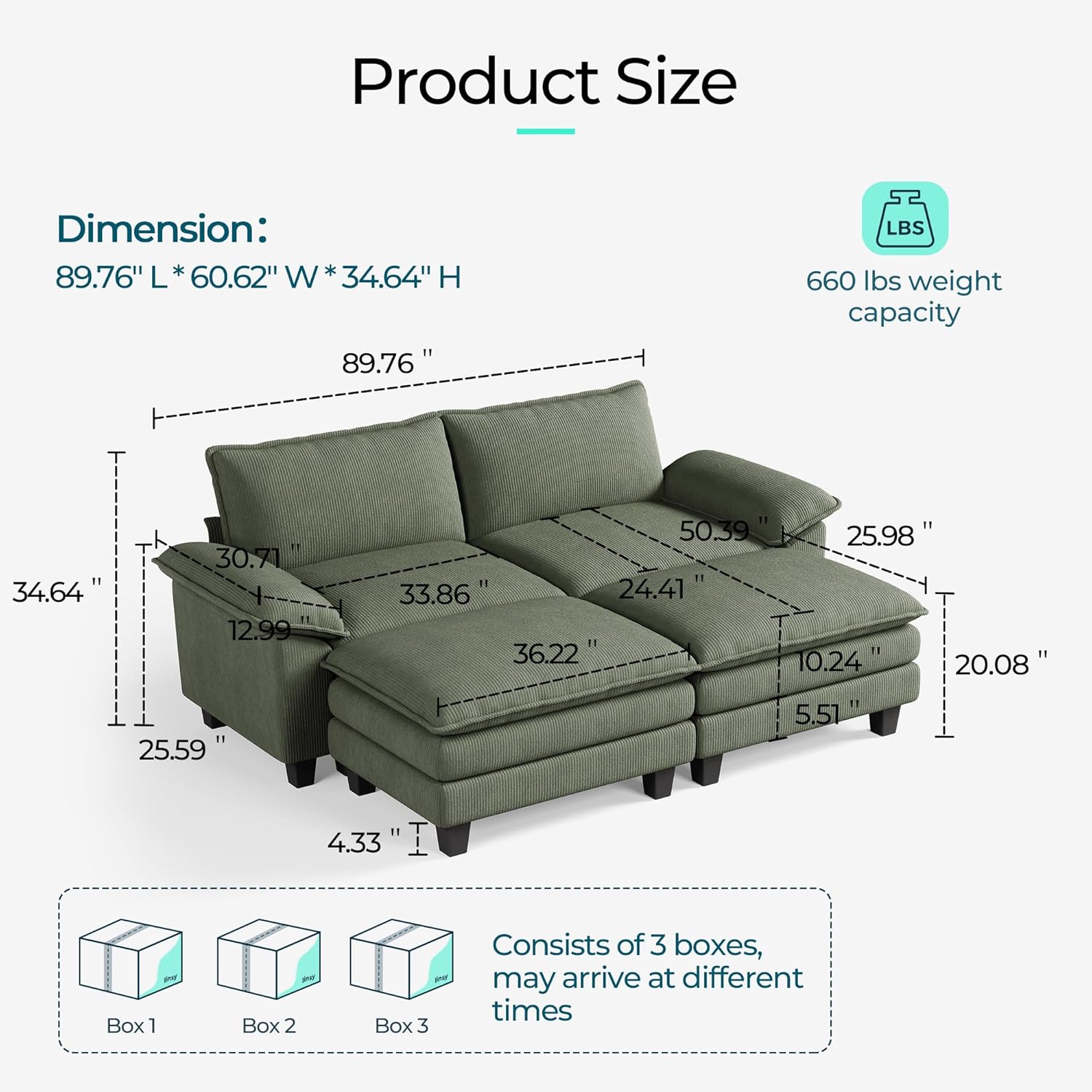 LINSY HOME Modular Sectional Sofa - 90'' Sleeper Sofa Cloud Couch Oversized Corduroy Sofa Bed with Movable Ottoman Soft Modern Comfy Couch for Living Room Apartment Office, Green