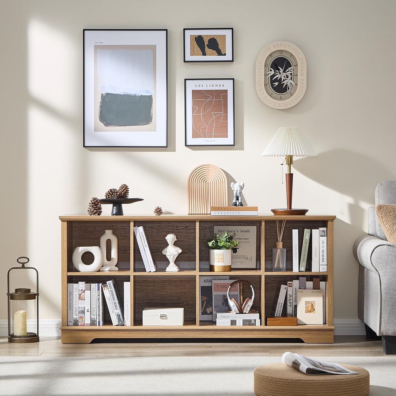 Farmhouse 8 Cube Bookshelf, Storage Organizer Bookcase, Kids Toy Storage Cabinet, Long Bookshelves Storage Organizer Shelf, Wood Display Cabinet Book Shelves for Bedroom,Living Room, Natural Oak