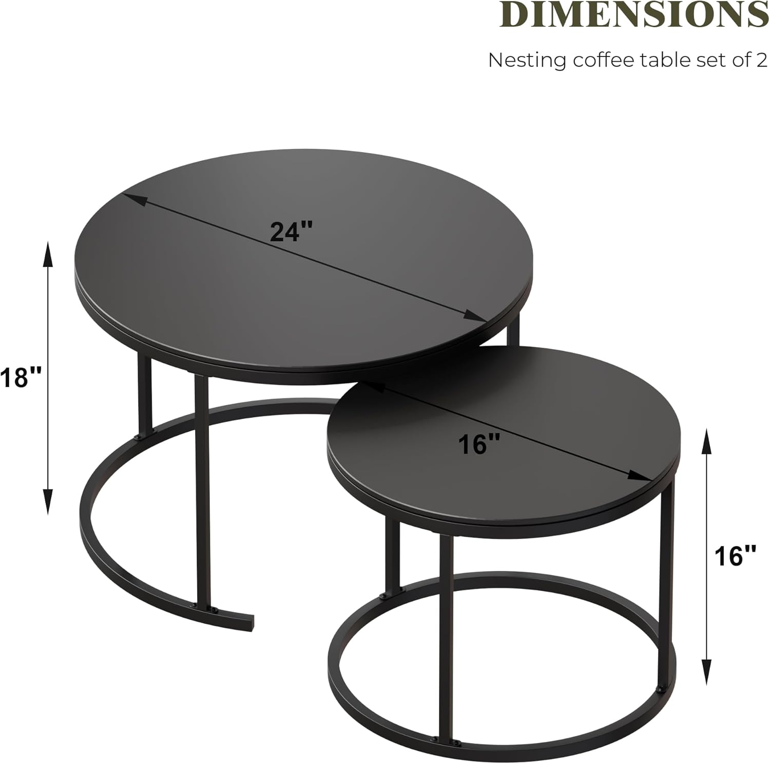 - [Sturdy and Durable] Nesting coffee table set of 2 for living room, includes a larger table and a smaller round coffee table, small nesting table: 16"(D) x 16"(H), large nesting table. 24"(D) x 18"(H). Our durable and stable nesting coffee table consists of a sintered stone table top and sturdy metal legs.