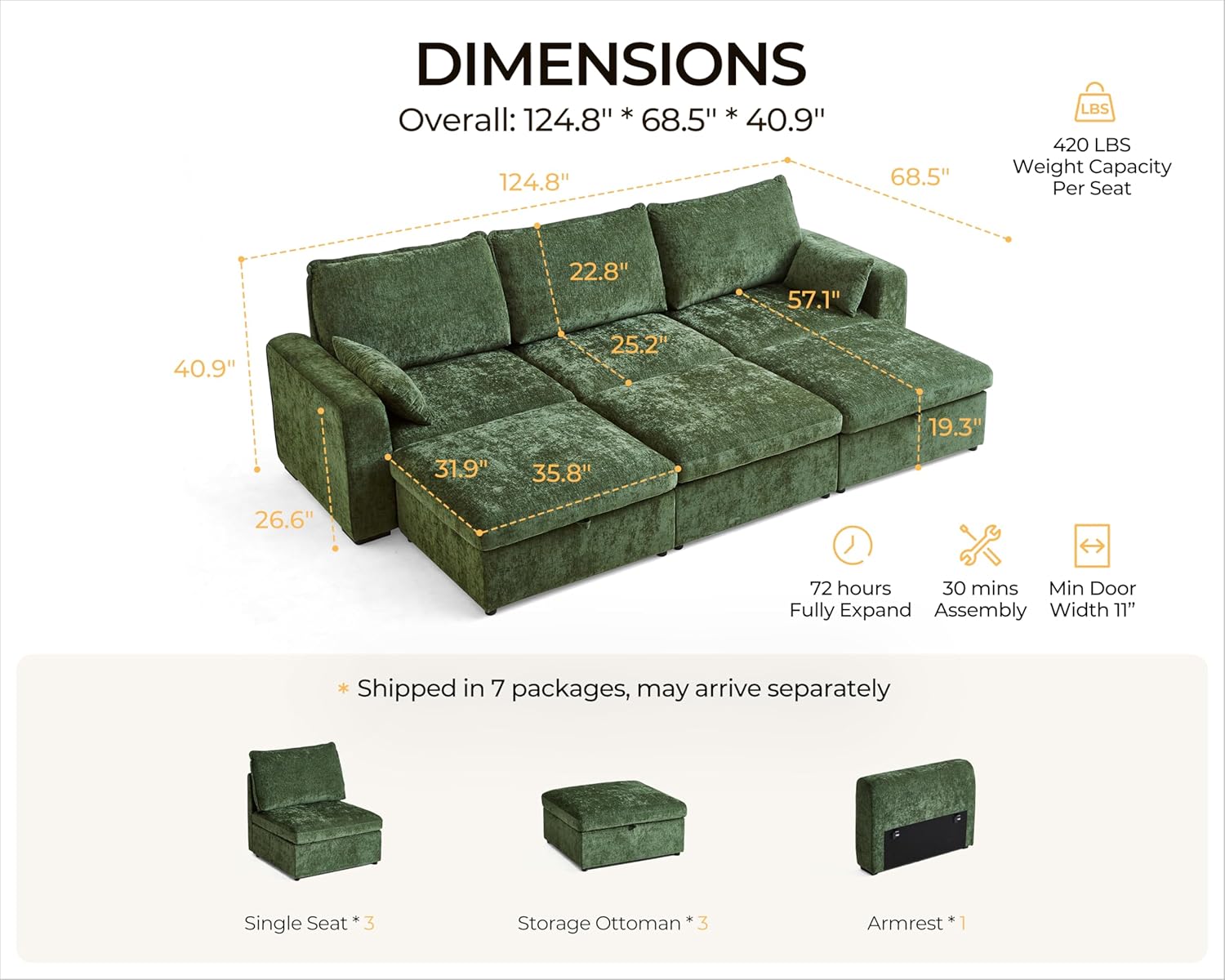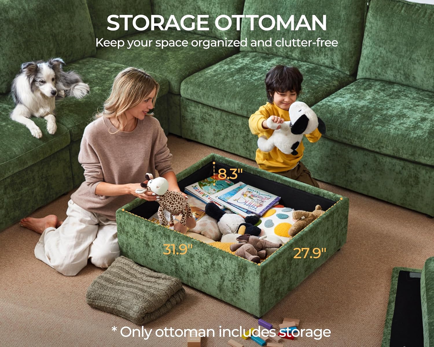 Oversized Modular Sofa Comfy Cloud Couch with Storage, Extra Deep Plush Sectional Sofa Set for Living Room, Covers Washable, Chenille, Olar (Green, 6-Seater with 3 Ottomans, Sleeper)