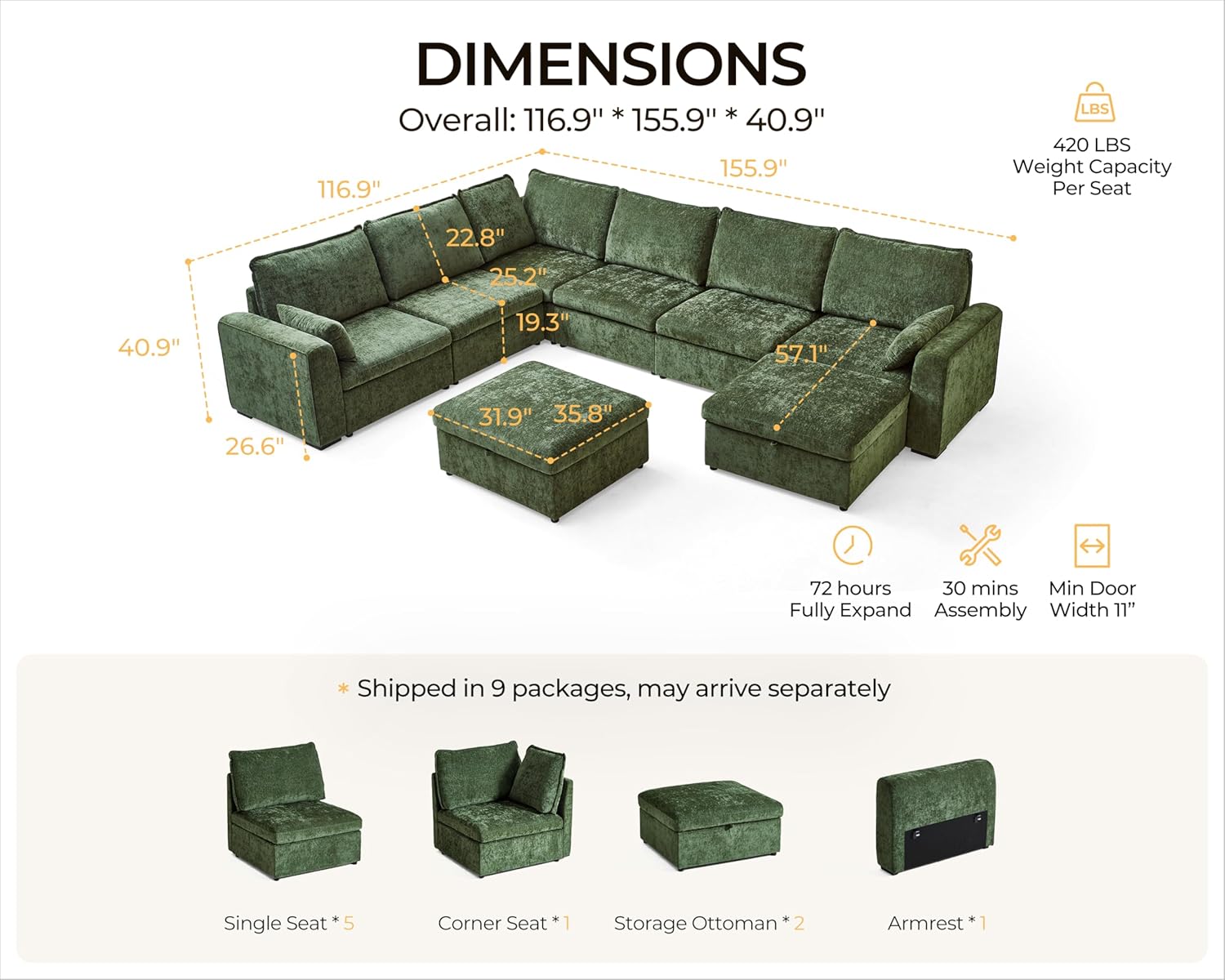 Oversized Modular Sofa Comfy Cloud Couch with Storage, Extra Deep Plush Sectional Sofa Set for Living Room, Covers Washable, Chenille, Olar (Green, 8-Seater with Corner & 2 Ottomans, u-Shaped)