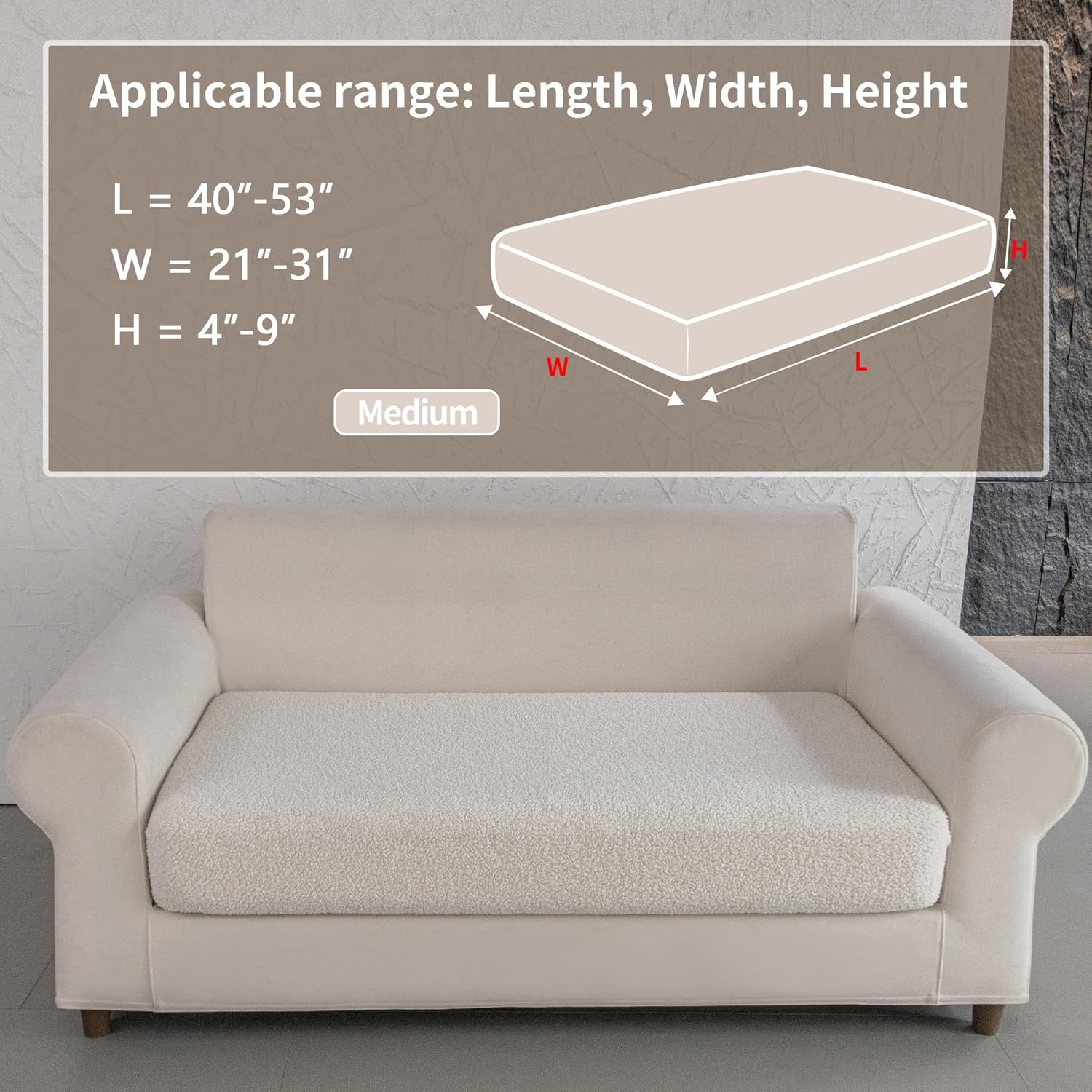 - 1.WHAT YOU WILL GET: 1*Seat Cushion Cover M. Suitable for sofa cushions with Length: 40-53 inches, Width: 21-31 inches, Height: 4-9 inches.This sectional couch cover is tailor-made for your sofa and can effectively resist stains, dust, pet hair and daily wear and tear.Made of soft Polar Fleece fabric, it adds a cozy and warm touch to your seat.