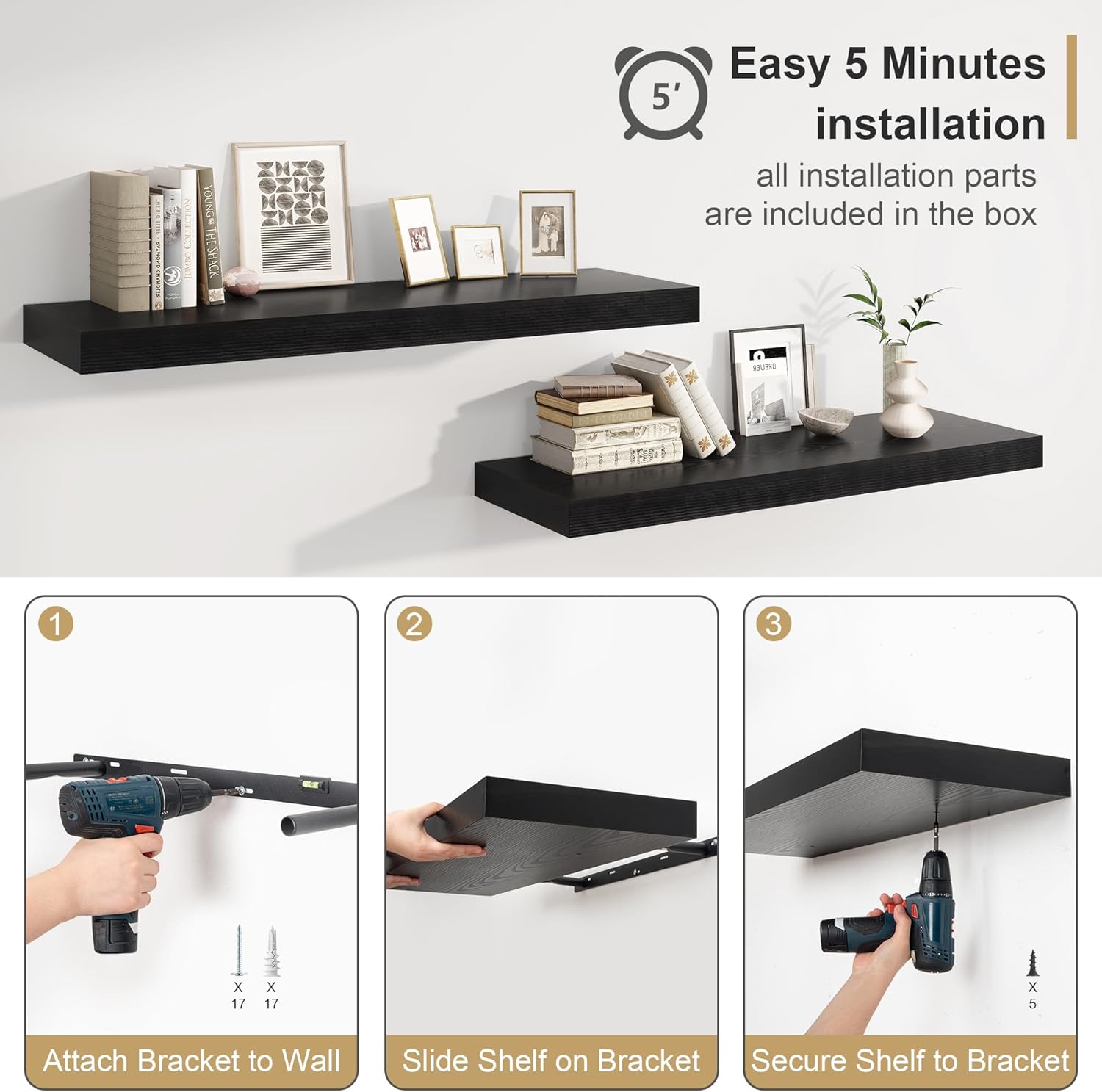 Heimlove 12" Deep Floating Shelves Black,Over Toilet Long Wall Mounted Modern Farmhouse 36 inches,Wall Shelves with Invisible Brackets for Bedroom, Bathroom, Living Room, Kitchen, Set of 1