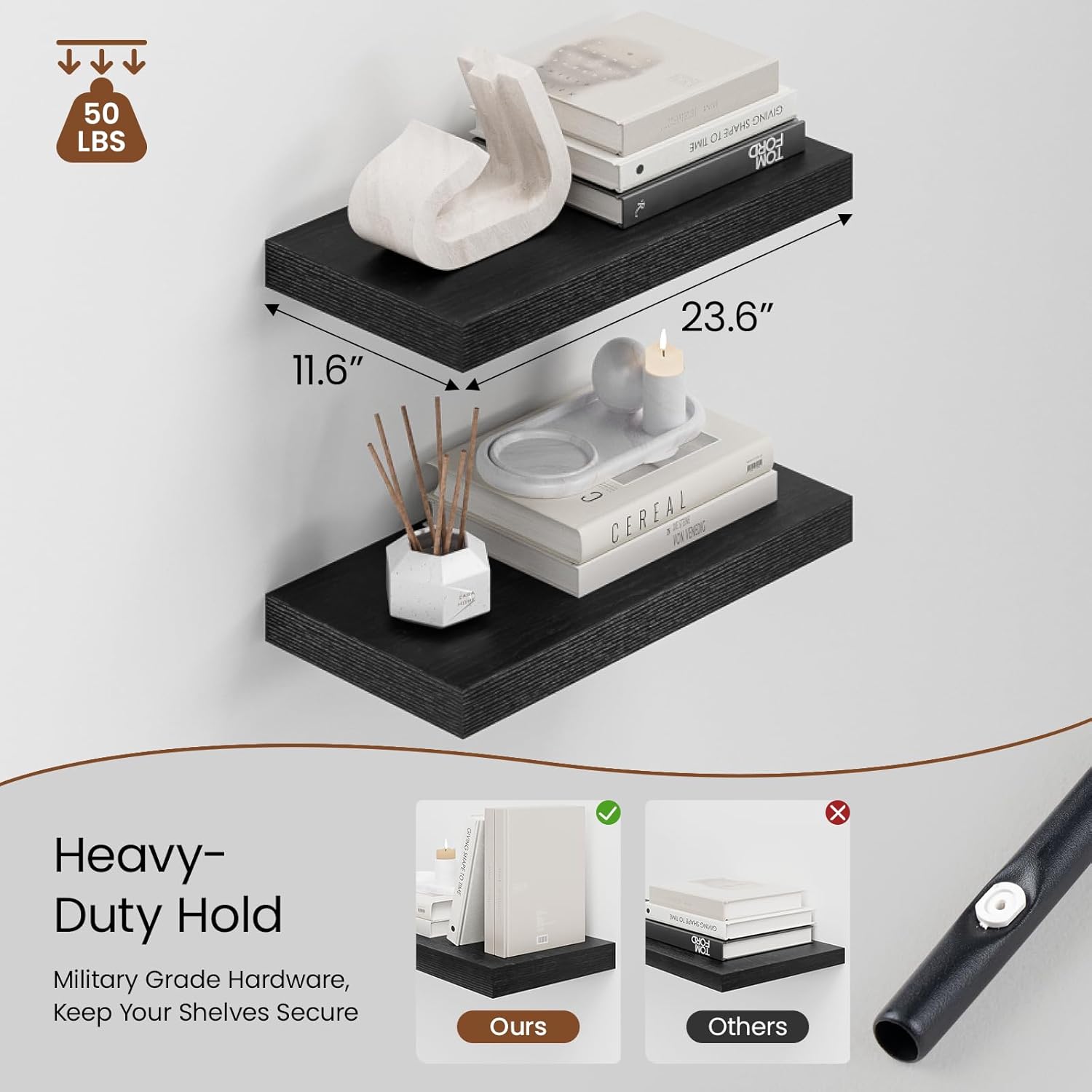 - Extra Deep Floating Shelves: Measuring 11.6” D x 23.6” W x 1.5” H, these shelves are crafted for maximum depth and durability. The spacious 12” depth gives you plenty of room for stylish display, organized storage, and decorative accents. Perfectly suited for your bathroom, kitchen, or living room, they enhance both function and flair in any space!