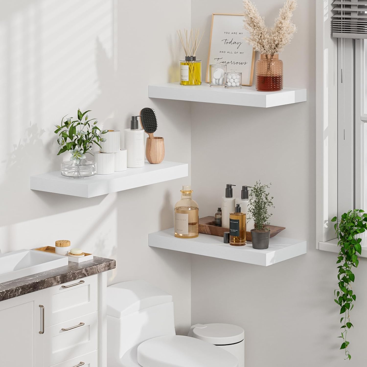 - Extra Deep Floating Shelves: Measuring 11.6” D x 23.6” W x 1.5” H, these shelves are crafted for maximum depth and durability. The spacious 12” depth gives you plenty of room for stylish display, organized storage, and decorative accents. Perfectly suited for your bathroom, kitchen, or living room, they enhance both function and flair in any space!