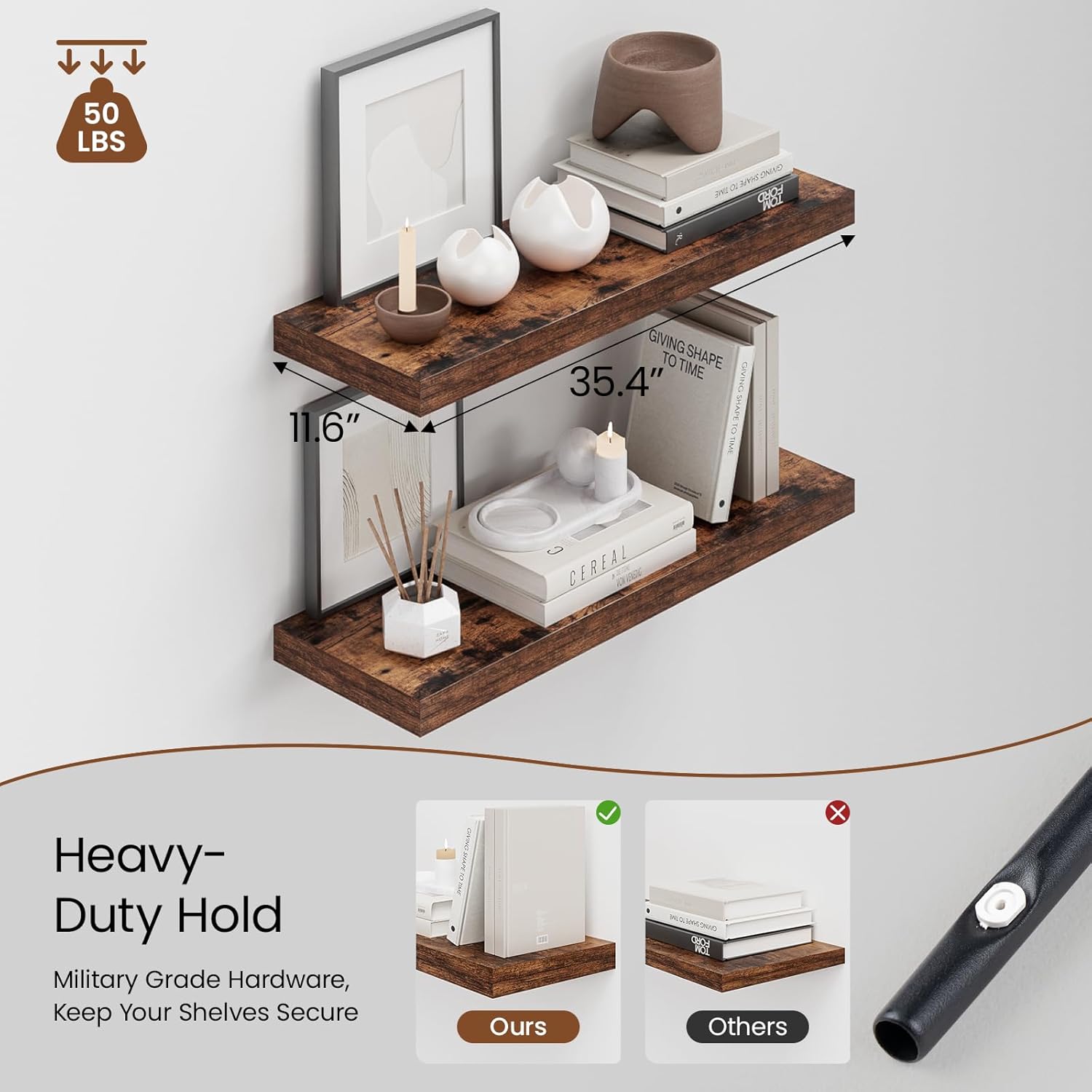 Heimlove 36 Inch Long Floating Shelf for Wall, 12" Deep Floating Shelves Wall Shelves for Bedroom Living Room Bedroom,Wall Mounted Shelves for Storage Book Decor, Set of 2, Rustic Brown