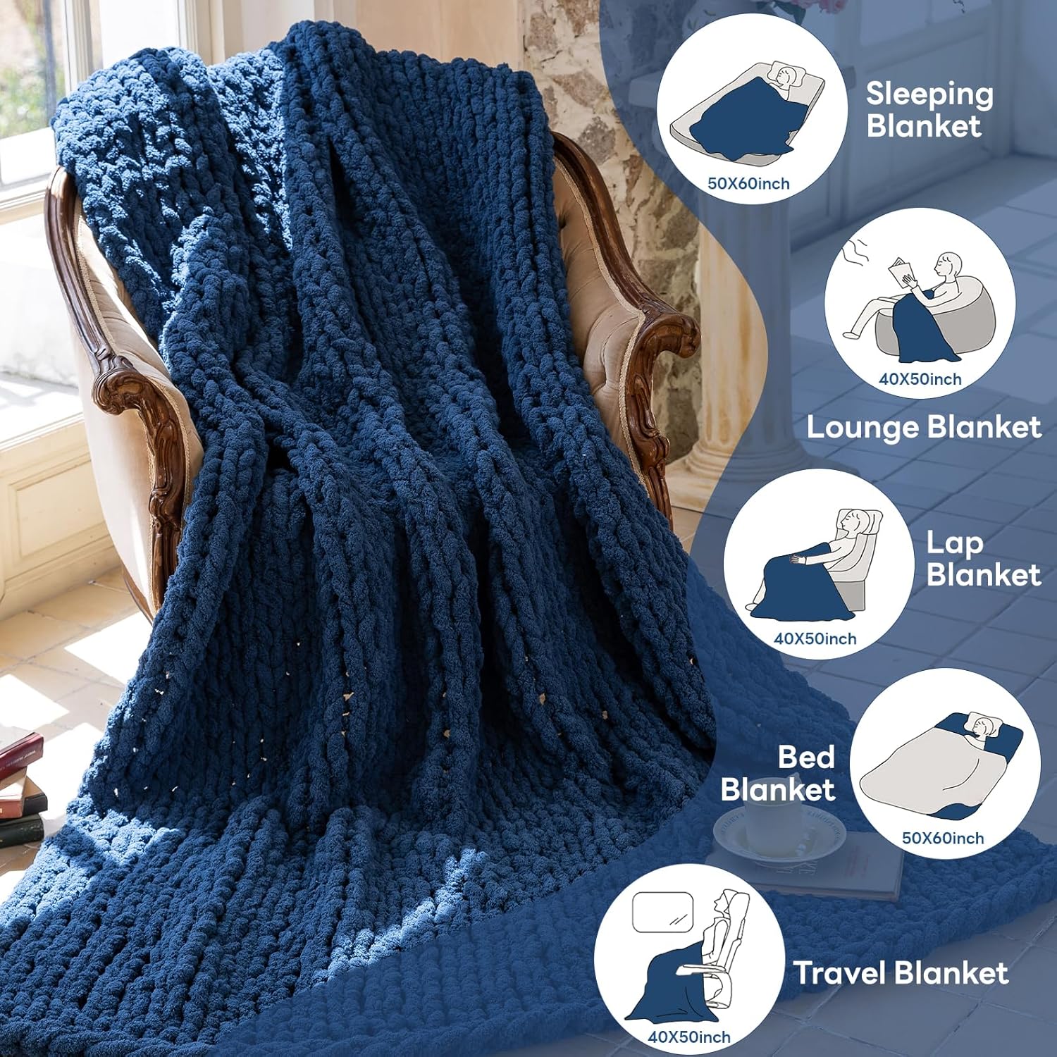 Chunky Knit Blanket - Luxury Soft Cozy 50 * 60 Throw Blanket,100% Woven Blanket Rope Knot Throw Blanket for Couch, Sofa, Home Decor, Gift - Machine Washable(Deep Blue)