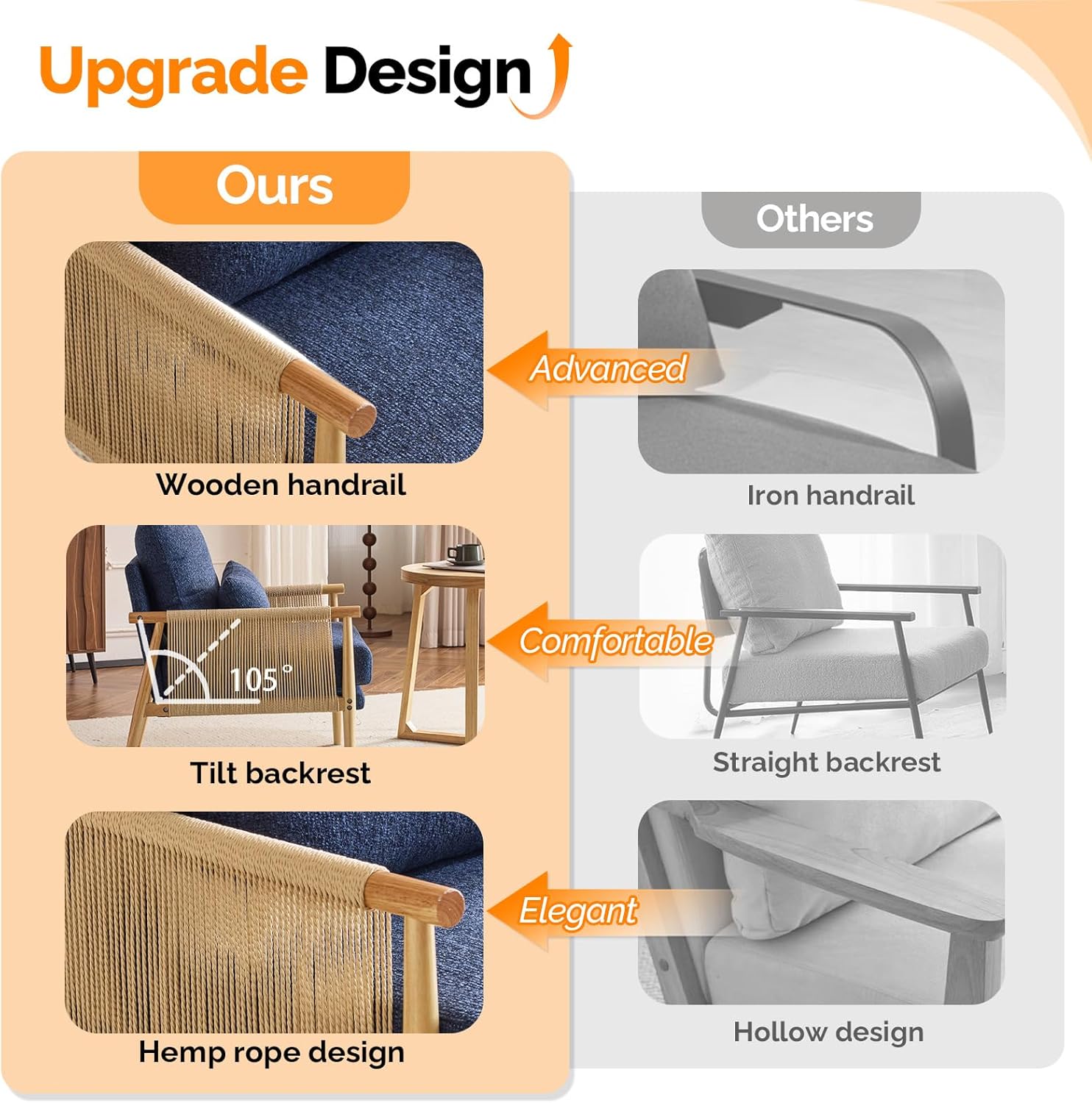VINGLI Boho Braid Accent Armchairs Set of 2,Mid-Century Modern Chiars with Solid Wooden Armrest,Comfy Louge Cushion Chairs with Waist Pillow for Bedroom,Living Room,Reading Room, Blue