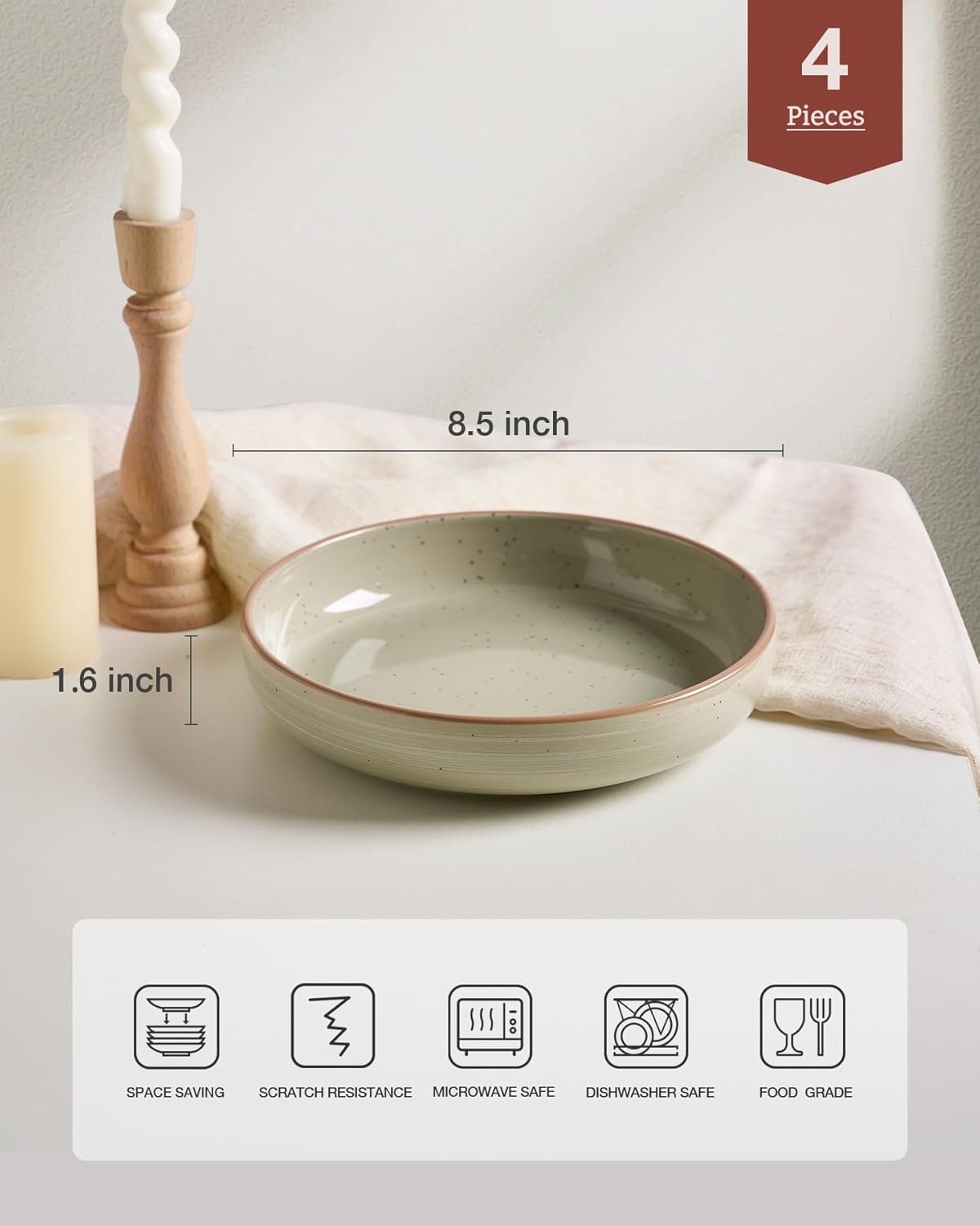 - PASTA BOWL SET OF 4 - Ideal size 8.5’’ Dia, practical depth 1.6’’ H, It holds contents both solid & liquid with ease- great for pasta, soup, dessert, ice cream, rice, beans and so on