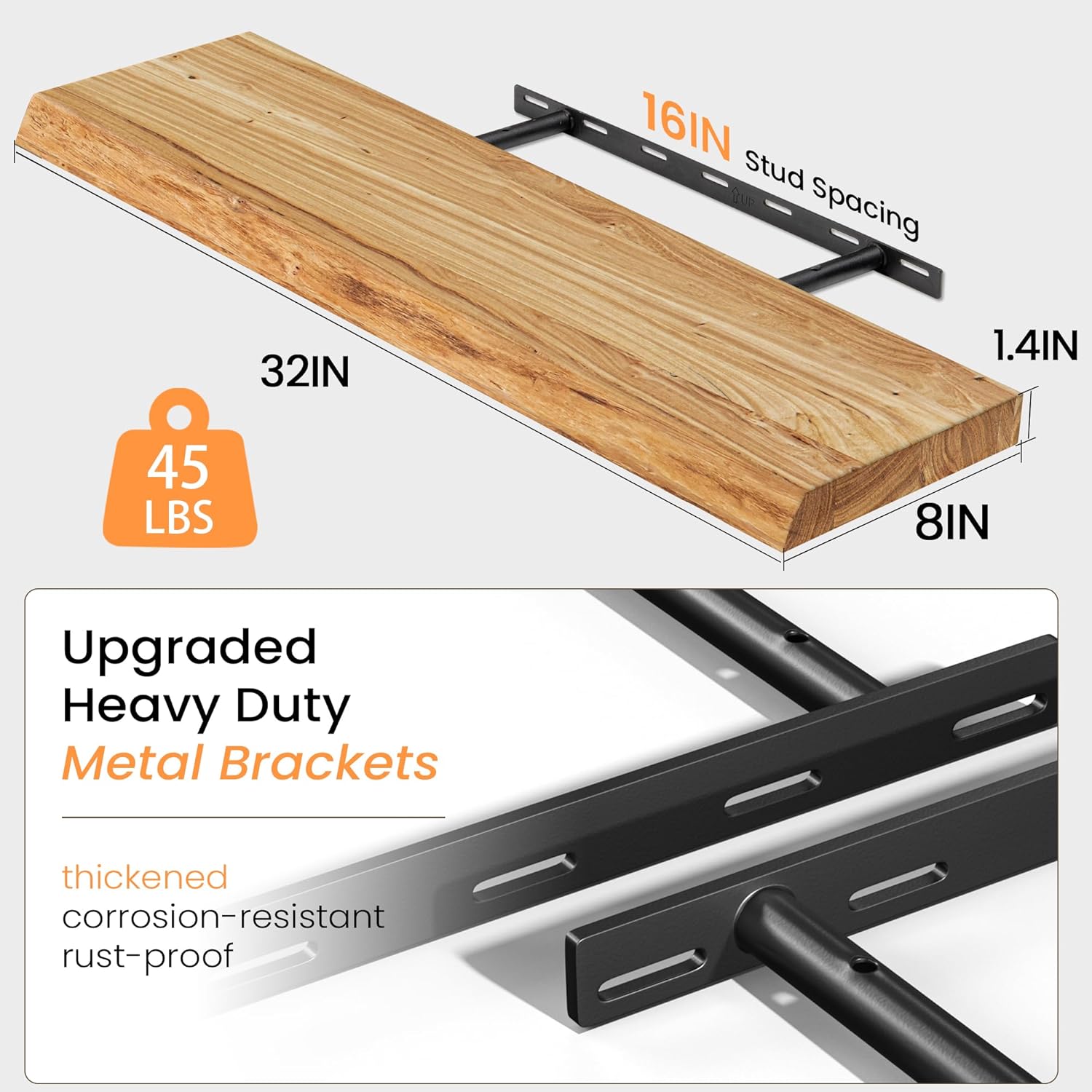 Floating Shelves for Wall, 32" Live Edge Solid Elm Wood Floating Shelf, Wall-Mounted Display Shelves with Invisible Heavy-Duty Metal Bracket, Floating Shelf for Kitchen (Natural, Set of 2)