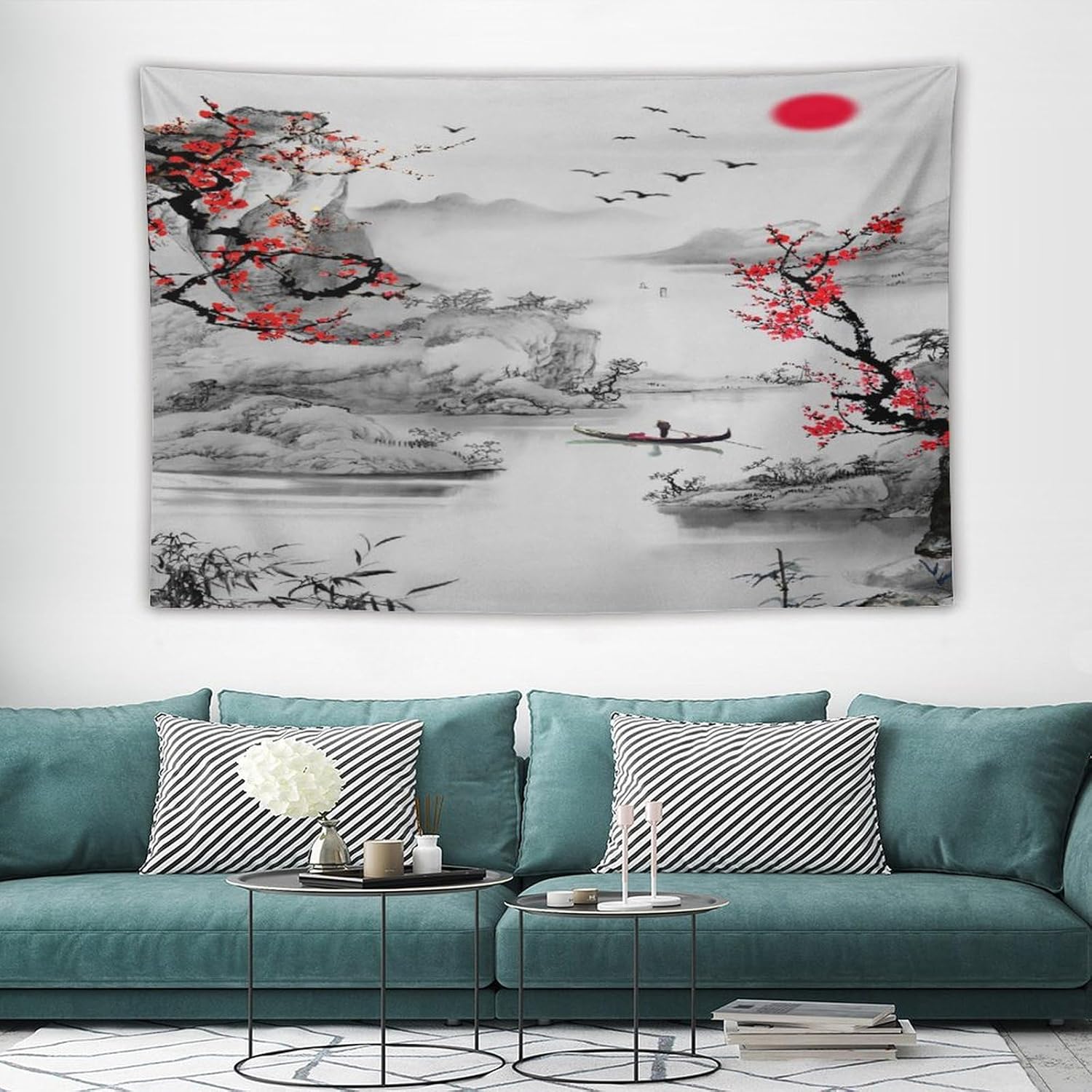 Cherry Blossoms Tapestry, Japanese Red Landscape Watercolor Abstract Art, Asian Japanese Wall Tapestry, Nature Landscape Tapestries for Bedroom Living Room Decor 60"x40"
