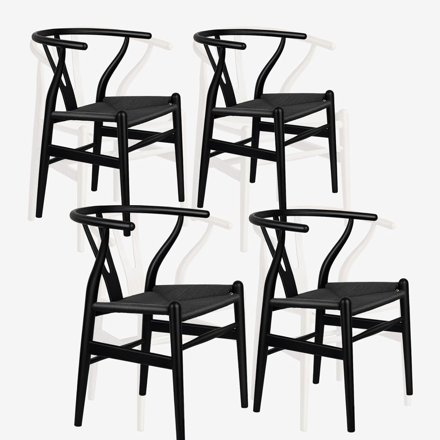 Wishbone Chair Natural Solid Wood Dining Chair/Hans Wegner Y Chair Rattan and Wood Accent Armrest Chairs Set of 4 (Ash Wood + Black 4 Chairs)