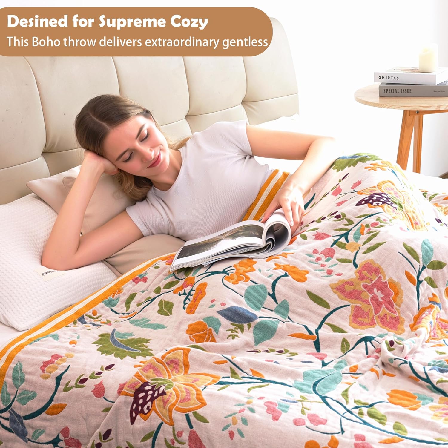 - PREMIUM 100% COTTON CONSTRUCTION: Crafted with exclusive 4-layer breathable cotton fibers in pure natural structure, premium cotton that delivers a baby-soft Class A texture,our boho throw blanket ensures superior softness & temperature regulation. Measuring 91" x 98" 4lb