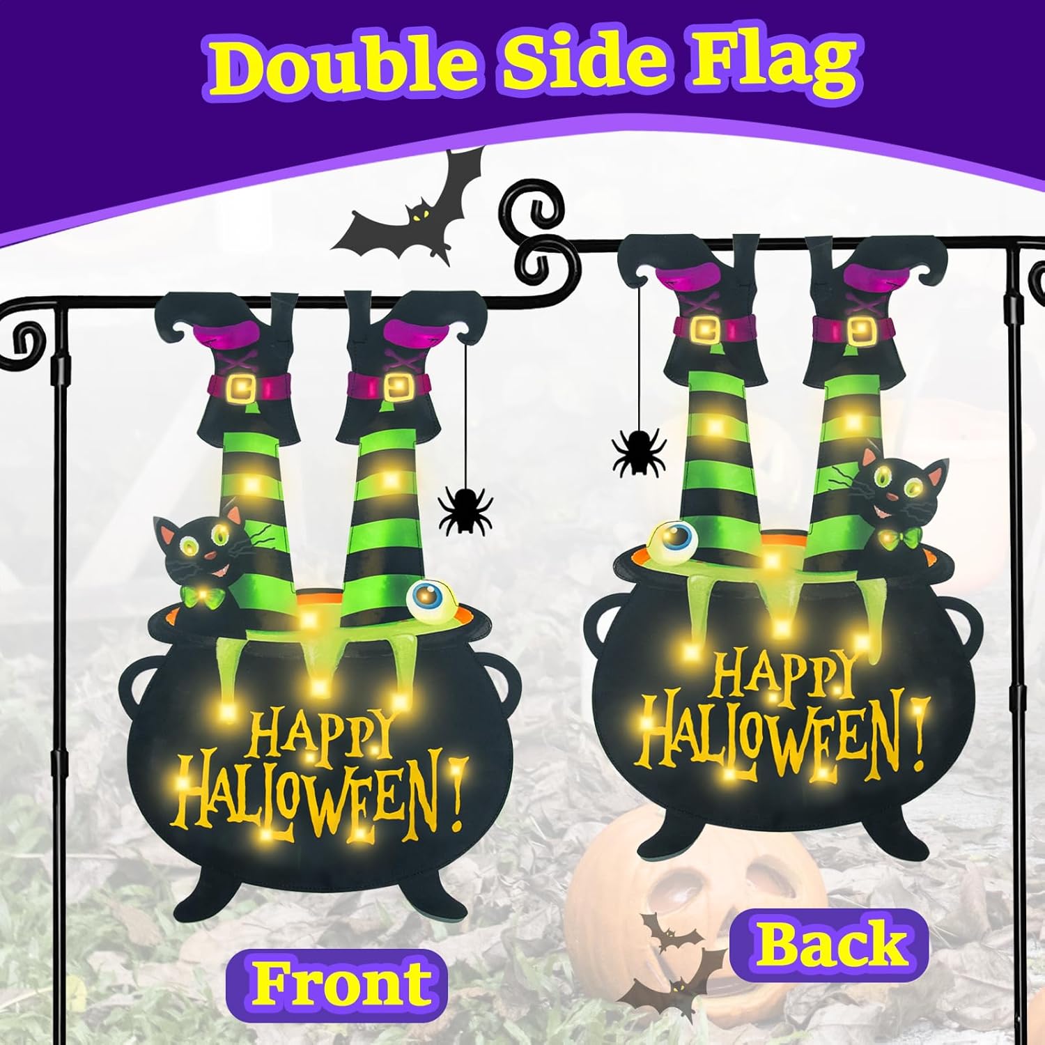 Halloween Lighted Garden Flag for Outside, Witch Feet Shape Flag Yard Decor, 8 Modes 12x18 Double Sided Cauldron Eyeball Black Cat Outdoor Hlloween Decorations for Home Porch(Warm White-12x18)