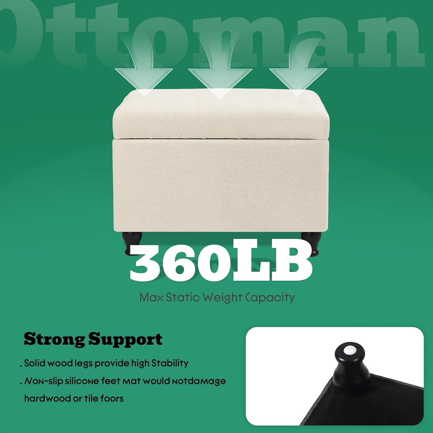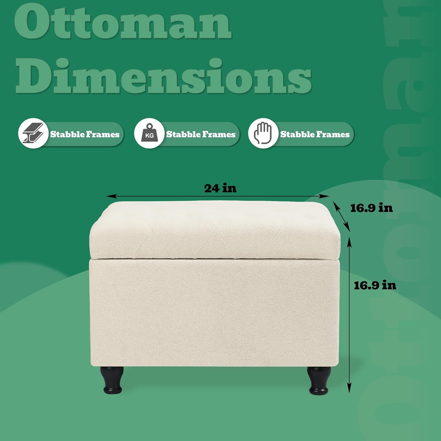 - ăProduct DimensionăâCrafted with meticulous attention to detail, this large storage ottoman bench spans 24.0 inches in length, 16.9 inches in width, and 16.9 inches in height, and a robust 360-pound weight capacity, If you have any questions about the product, please contact us and we will be honor to assist you.