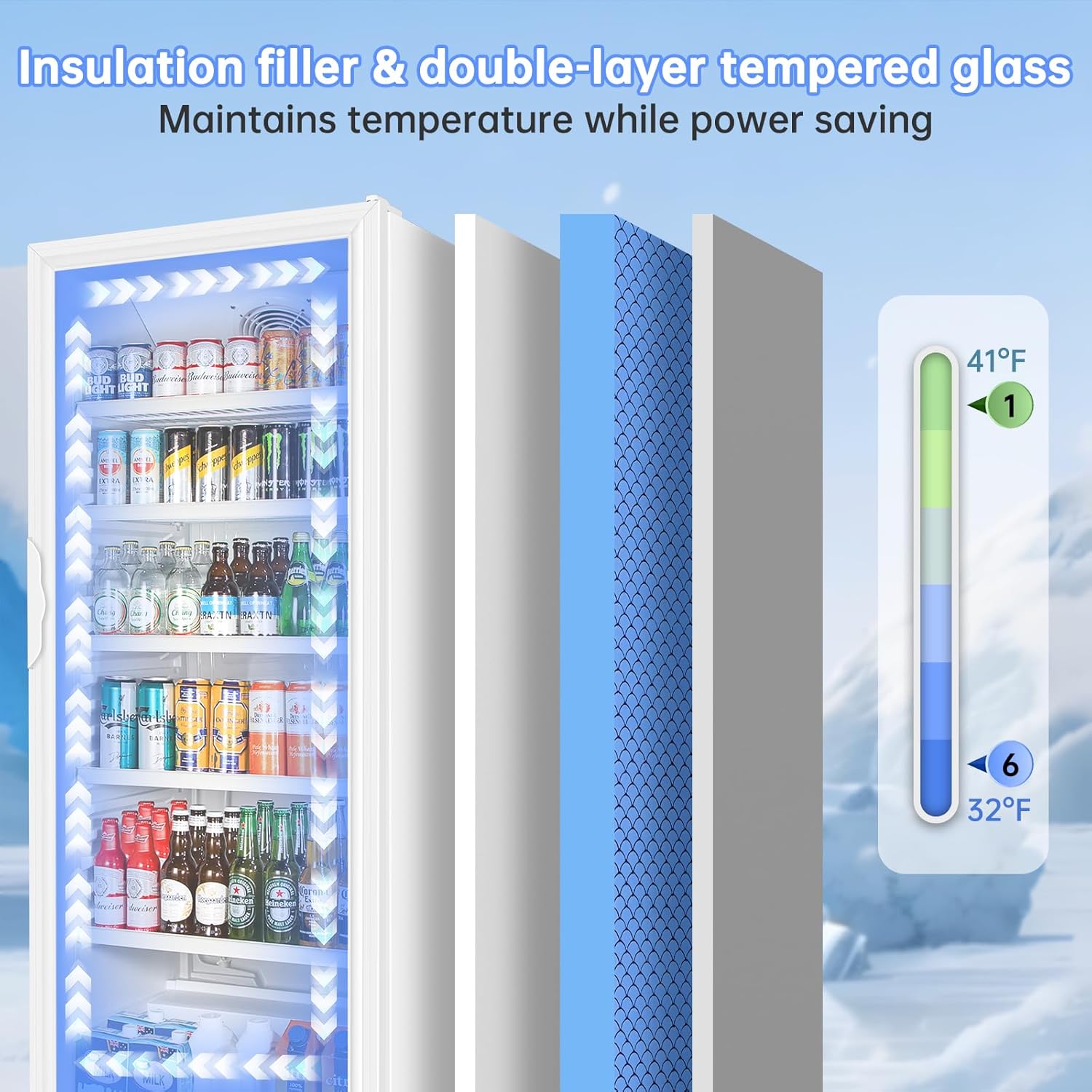 - AUTOMATIC DEFROST SYSTEM: The automatic defrost technology eliminates the need for manual frost cleaning. Combined with double-glazed glass, sealing strips, and an insulation layer, this fridge effectively blocks heat, maintaining a consistent temperature between 32-41°F (0-5°C) to keep your drinks refreshingly cold and ready to serve.