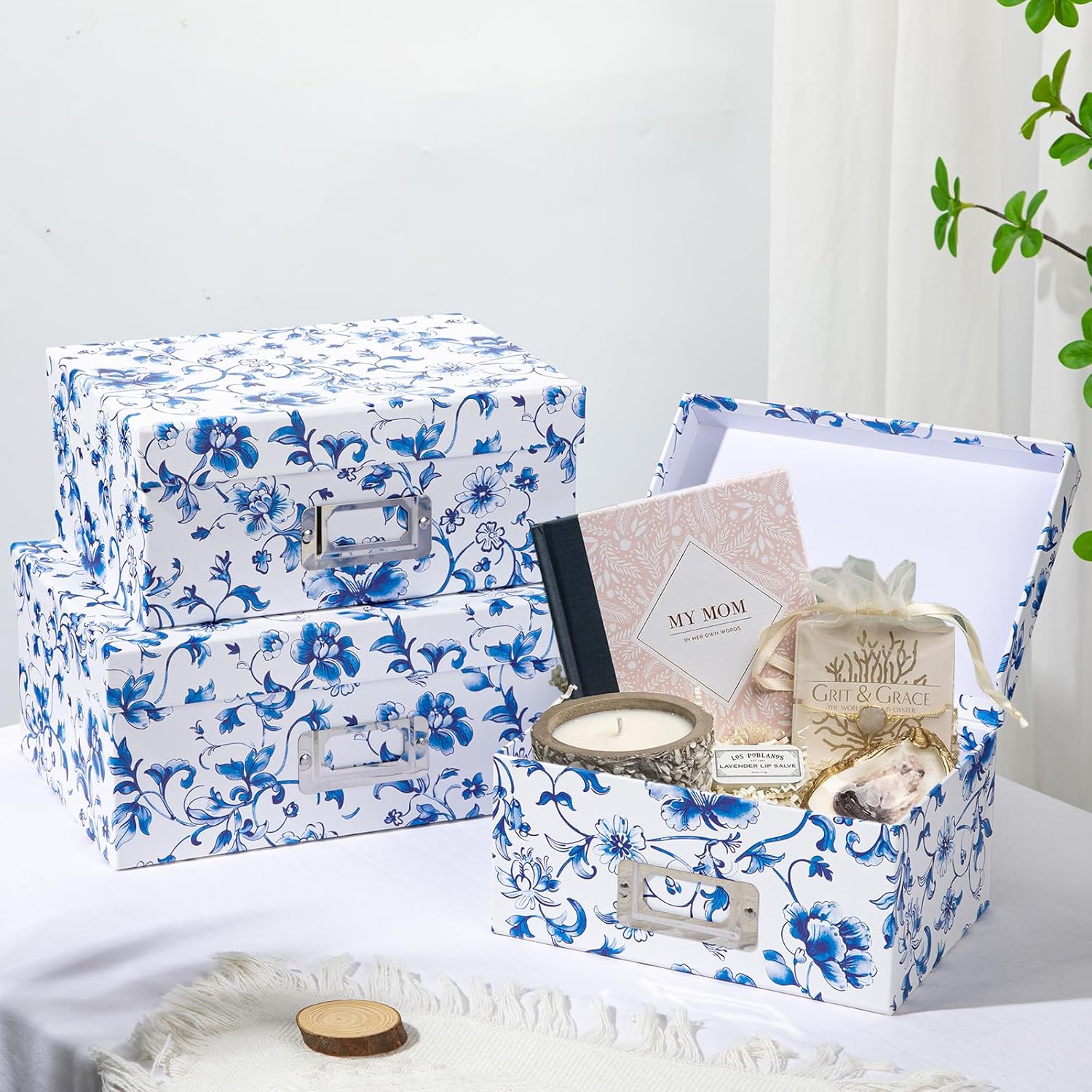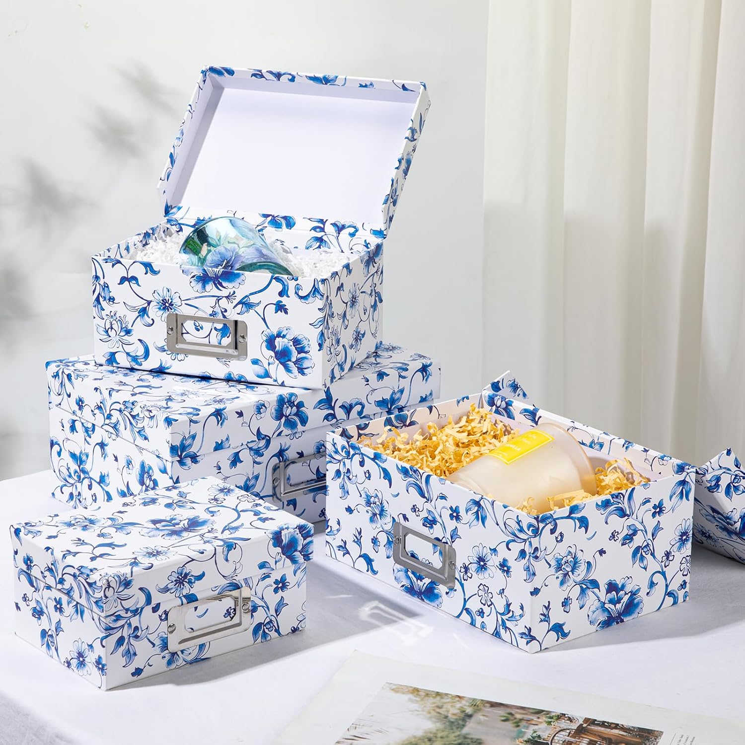 Briful Decorative Photo Storage Boxes with Lids, Set of 4 – Blue and White Porcelain Pattern, Nested Card Storage Box Organizer, Decorative Paperboard Box for Closet, Office, Gifts,Cosmetic,Books