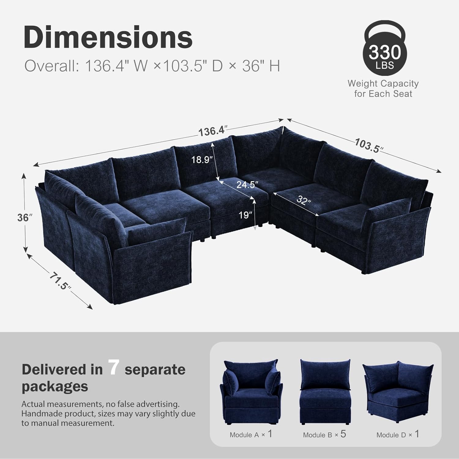 - š” Stylish and Spacious Sectional Sofa - A blend of modern elegance and comfort, this blue sofa is ideal for contemporary interiors. Customize seating and shape by adding or removing modules to fit your needs. It's perfect for your living room, family room, bedroom, or office. Overall size: 136.4" W Ć 103.5" D Ć 36" H, seat width: 32", seat depth: 24.5".