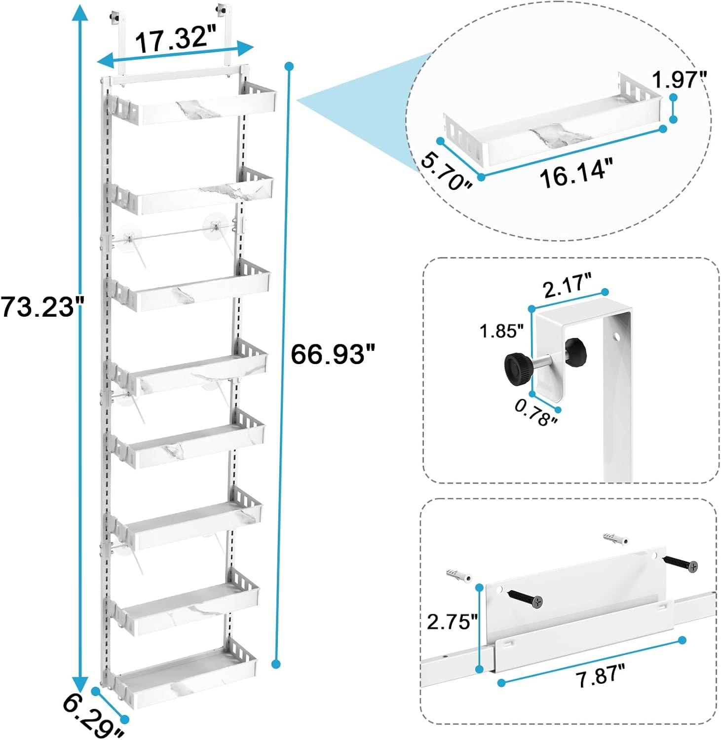 bukfen Over the Door Pantry Organizer,8-Tier Adjustable Basket Kitchen Pantry Door Organization and Storage, Heavy-Duty Metal Hanging Kitchen Spice Rack,D6.3 x W17.32 x H66.93 inch,White Marble Color
