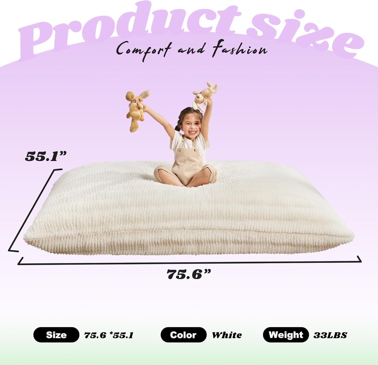 - Memory Foam Bean Bag Chair: The 3-in-1 giant bean bag chair stands out with its high-density memory foam filling, it can bounce back quickly, not only provide comfort but also support. The thickness of the bean bag is up to knees when you lay it down flat.