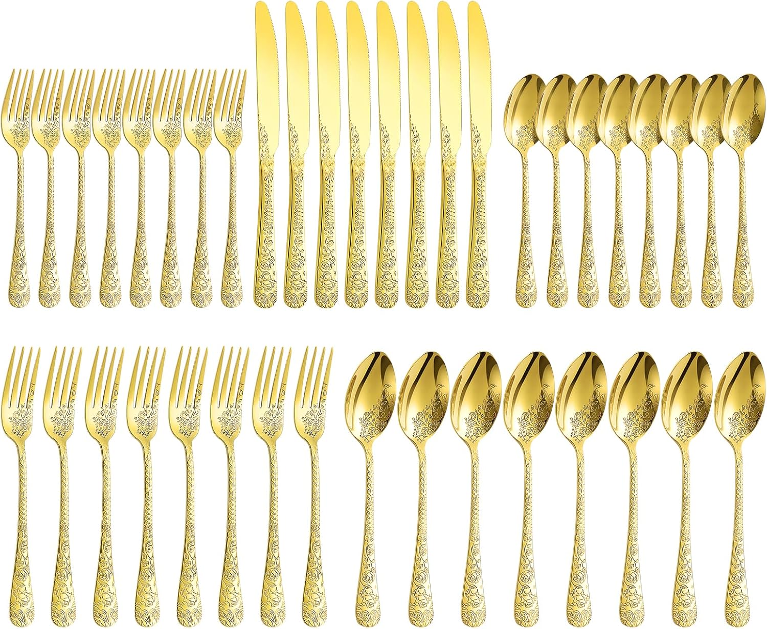 Floral 40 Pcs Gold Silverware Set for 8, Food Grade Stainless Steel Flatware Set with Rose Flower Embossed Design, Eating Utensils Sets Include Fork/Knife/Spoon, Reusable Cutlery Set, Dishwasher Safe