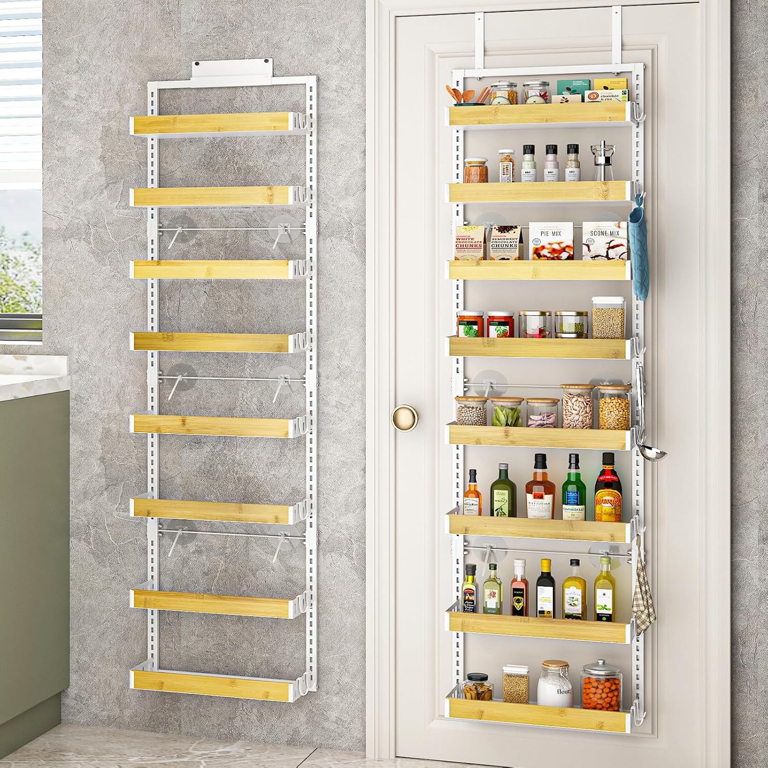 - 【Large Capacity and Stable Structure】8-layer large capacity can be reasonable partition to place your things.Strong load-bearing,long-lasting and durable.Over The Door Pantry Organizer is made of high quality metal materials,with enhanced load capacity,robustness,rust resistance and stability